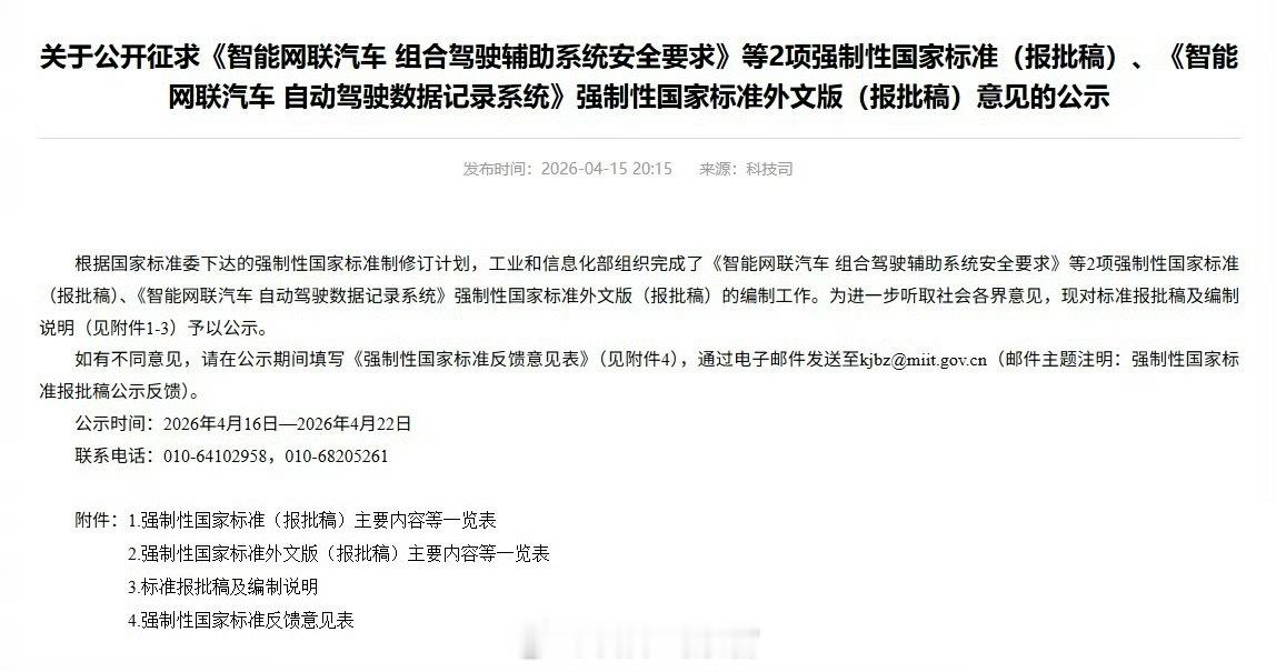 事关 L2 级辅助驾驶,相关强制性国标进一步公开征求意见,理想、地平线、蔚来、小鹏、华为引望、小米等单位联合起草。