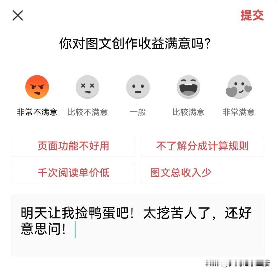 知道自己已被彻底打入冷宫,我每天来头条的时间越来越少了。下午接孩子的时候点进收益那栏看了看,好家伙今天的创作收益达到了近两年来的历史新低——整整2块1毛3! 我家吃的大米是最便宜的,这钱能买一斤大米,完全够我吃一天了。能在早餐店买两个白馒头,加点白开水怎么着都够我吃一顿了。 如果我用来买一袋盐做菜,应该够全家吃十多二十天还绰绰有余吧?真是一笔巨款啊!我应该知足的不是吗? 本来我都习以为常一笑而过了,它偏偏给我跳出一个对图文收益是否满意的图片来。 由于我连续回答了好几次非常不满意,它已经很多天没问我了,没想到今天又冒了出来。 嘿!你要当周扒皮就当周扒皮吧,悄悄咪咪搞剥削就是了,你咋还好意思张口问被自己虐待的长工牛马过得舒服不?自己心里没点数吗?! 我毫不犹豫地把四个选项一起选了,还加了一句补充:明天让我捡鸭蛋吧!太挖苦人了,还好意思问! 提交完心情那叫一个爽歪歪!没钱就没钱吧,反正我脸皮厚没事还是要写。哪怕明知道写出去没流量还有可能被关小黑屋都忍不住要吧啦吧啦! 我随便在快手签个到一分钟要不了就有一块钱,有时候还三四块,辛辛苦苦几小时码几千个字才2块钱。唉!想要坚持自己的热爱不容易啊!
