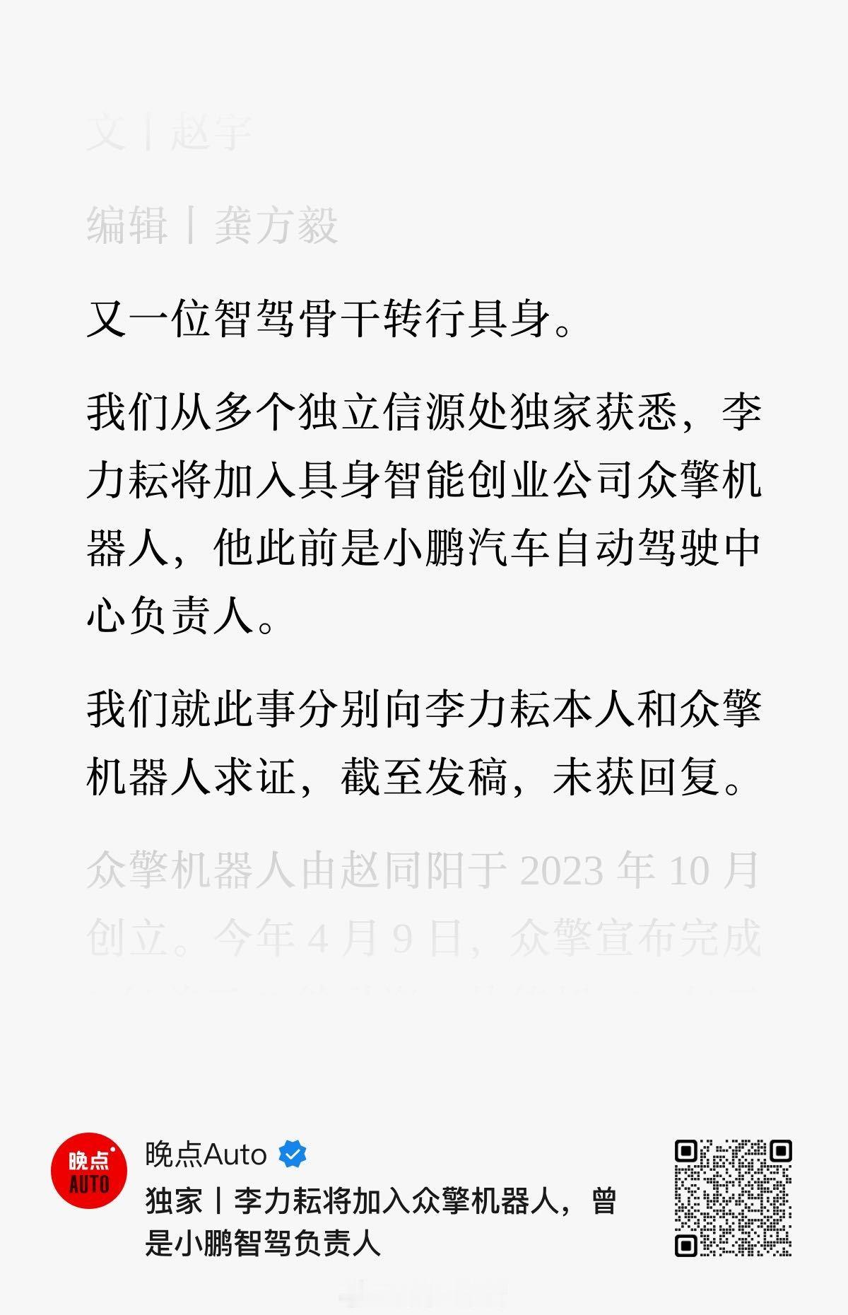 前小鹏汽车自动驾驶中心负责人李力耘将加入具身智能创业公司众擎机器人。