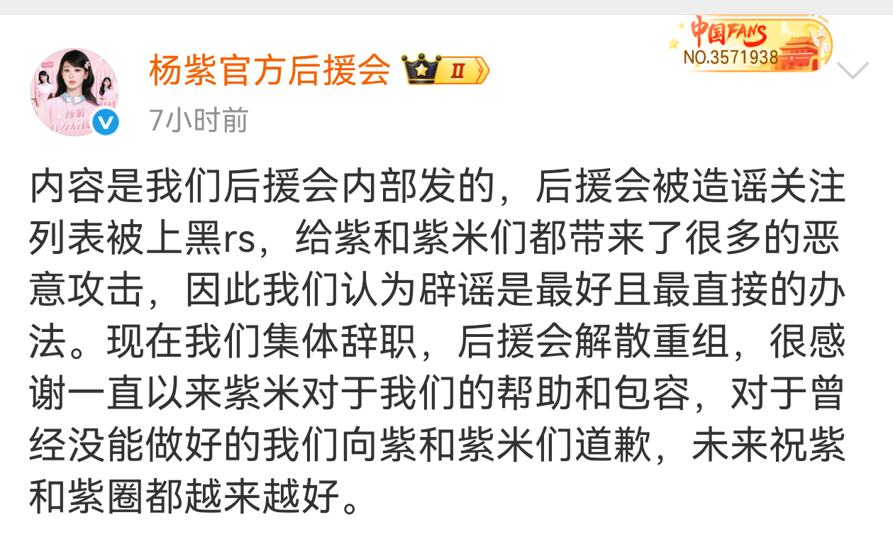 杨紫官方后援会皮下集体辞职,后援会解散重组 杨紫网宣与后援会协作关系破裂