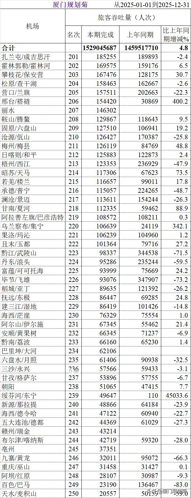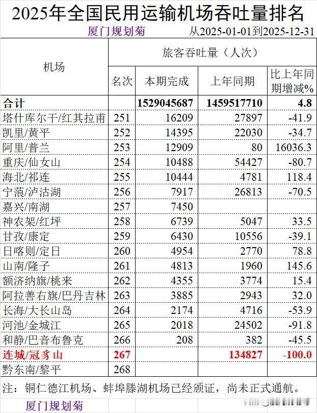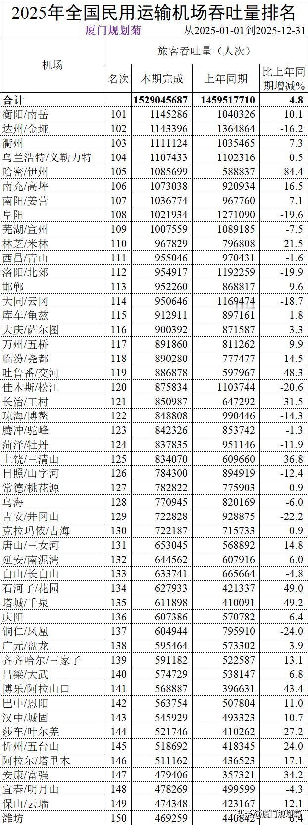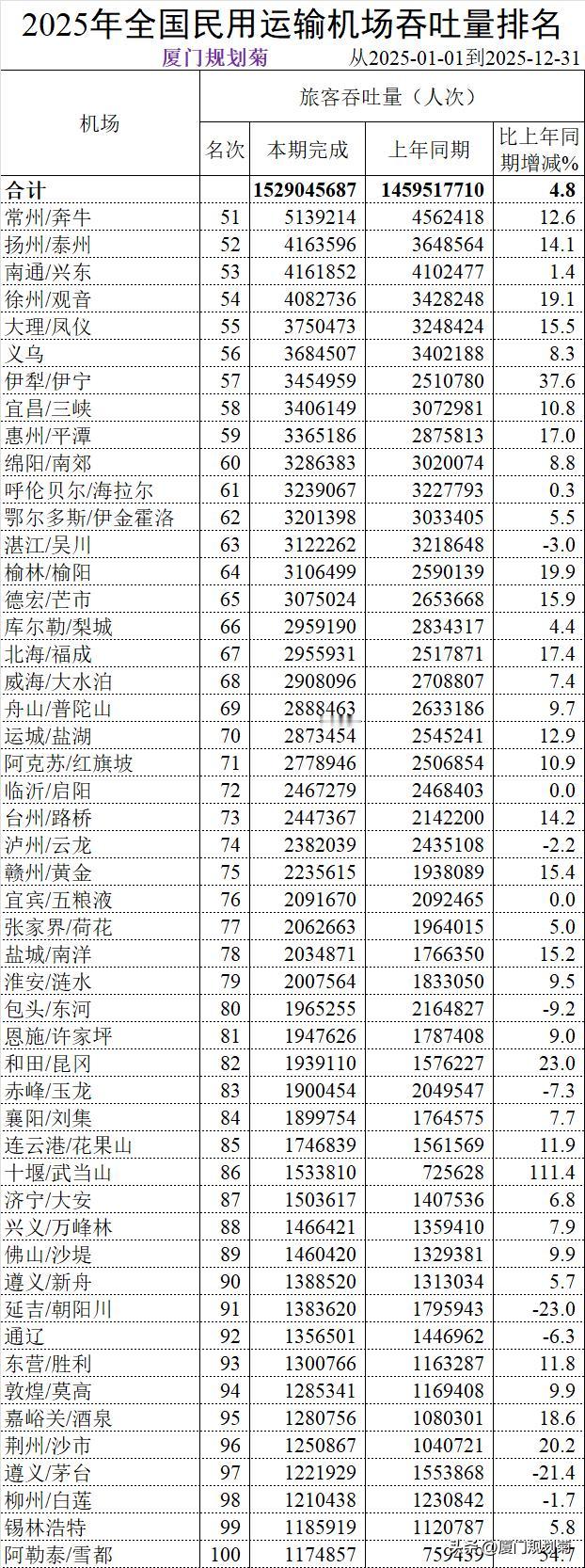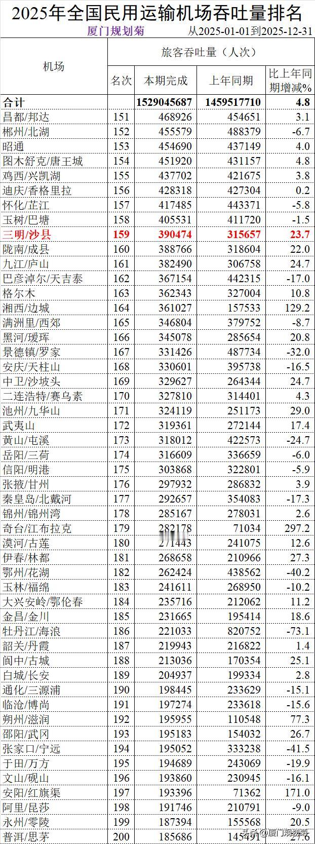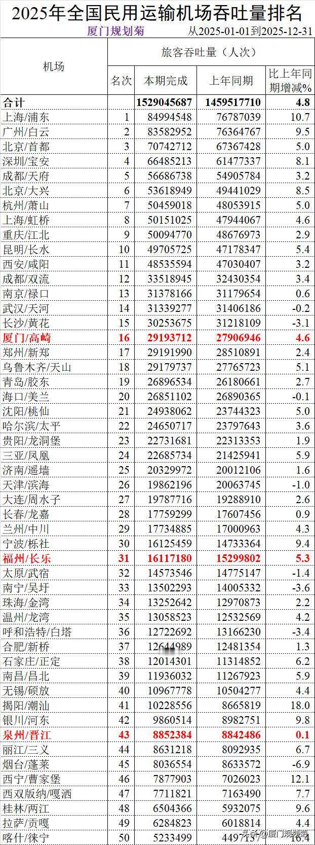 中国大陆268个机场2025年旅客吞吐量 本周民航局发展计划司公布了268个民用运输机场数据。 268个机场中我按照50个分页排序,把2025年福建省5个机场数据列举了下。 1、第16名厦门高崎机场,旅客吞吐量29193712人次。转场翔安前最后一个完整年度; 2、第31名福州长乐机场,旅客吞吐量16117180人次。目前二期扩建中; 3、第43名泉州晋江机场,旅客吞吐量8852384人才,微增长; 4、第159名三明沙县机场,旅客吞吐量390474人次。增长23.7%; 5、267名龙岩冠豸山机场,今年没有旅客吞吐量数据。 机场客流吞吐量 机场客流排行
