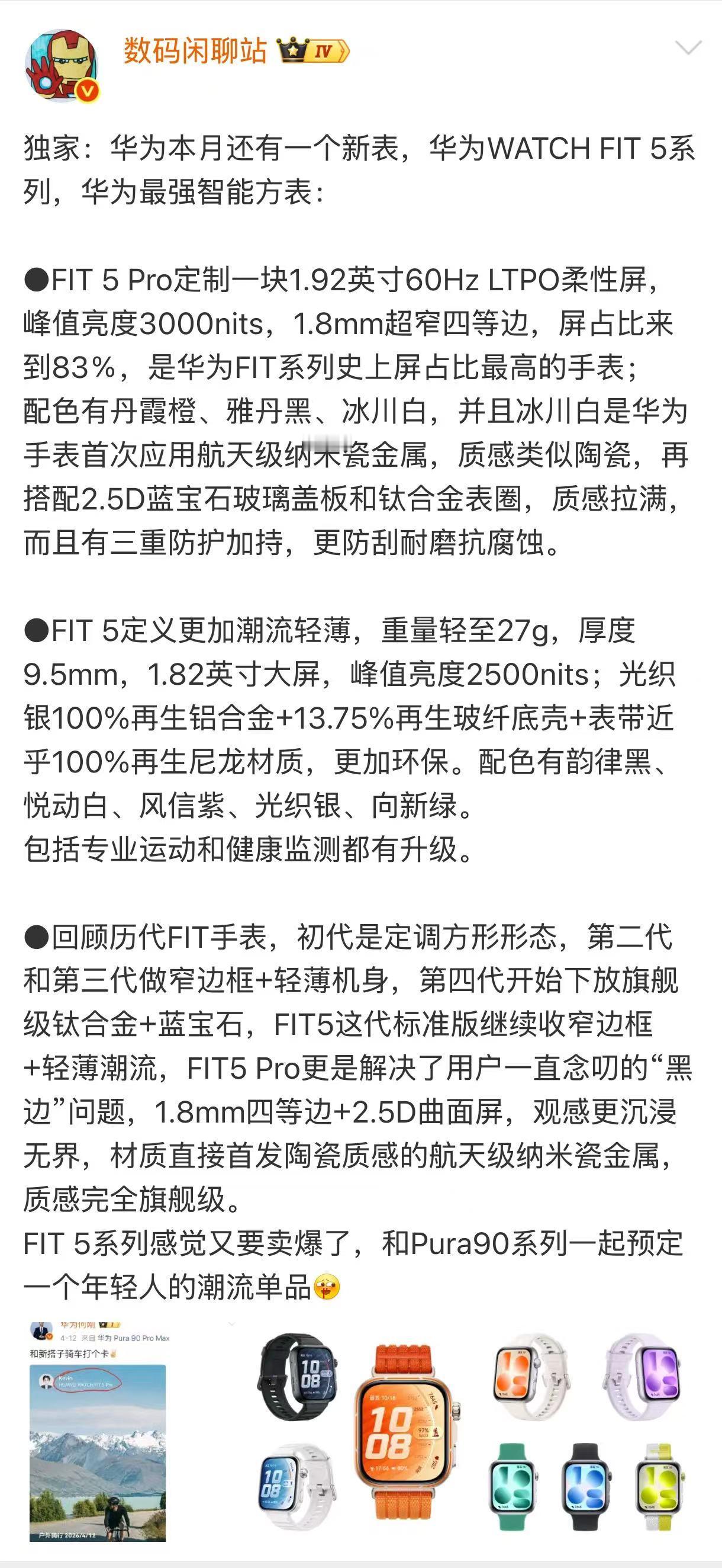 史上屏占比最大华为手表曝光华为WATCH FIT系列一直是我心中的智能手表的最佳形态。方表的屏占比空间更大,能更好地承载交互功能,还能满足我对简约、潮流的审美需求。今天也看到了华为WATCH FIT 5系列的预热海报以及其他博主的爆料,瞬间被狠狠种草!本代冰川白是华为手表首次应用航天级纳米瓷工艺,陶瓷质感颜值拉满,FIT 5 Pro还采用四边等距极窄边框,搭配曲面屏设计,视觉沉浸观感直接拉到新高度,结合博主的爆料,屏占比也是直接来到了历代最高。何总之前发过一条骑行搭子的微博,我大胆猜测,这款新品肯定会重点发力运动功能,不止骑行,或许还有其他新潮运动,新增年轻人爱打卡的运动模式。已经按捺不住期待,就等4月20日发布会揭晓全部真相!