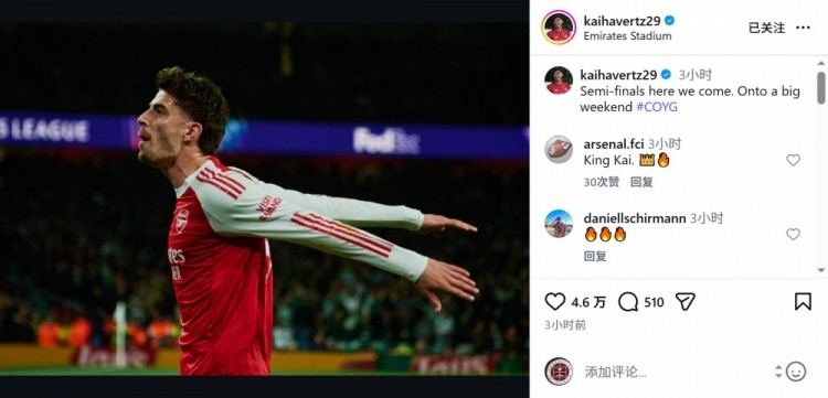 阿森纳球员哈弗茨社媒晒出庆祝的照片,配文:“半决赛我们来了,迎接一个重要的周末。”