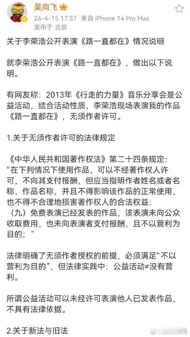 吴向飞发李荣浩相关情况说明吴向飞在声明中详细梳理了当年演出的商业性质、白身版权维权诉讼的结果,并公开质疑了音著协(中国音乐著作权协会)及环球音乐公司的授权合法性问题。
