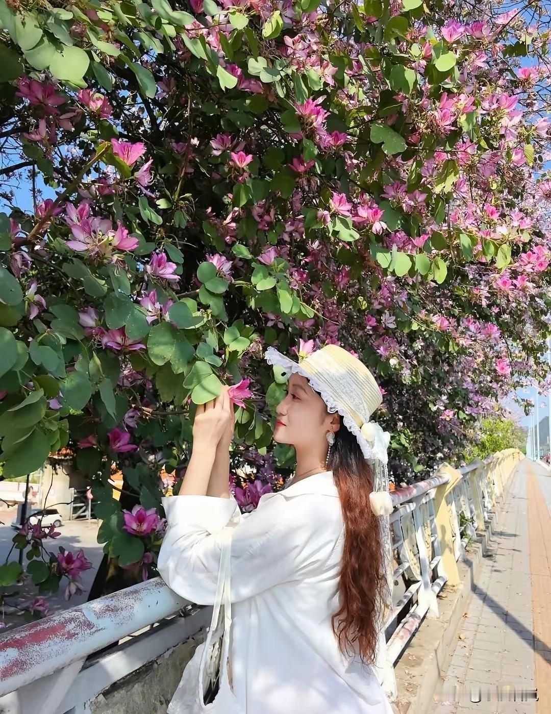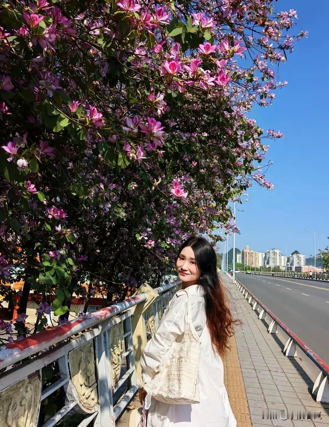 最美的街道,我不想说紫荆花开了路边的风景有多美,看过的游客都知道的,谁去赏花了,手机里面都会留有好多照片的。 图片里的紫荆花,叶子还没有落,要是叶子落光了,那树上满是粉红色的花,犹如满天的繁星点点。 看图出一条联:路树风吹花朵朵 下联: