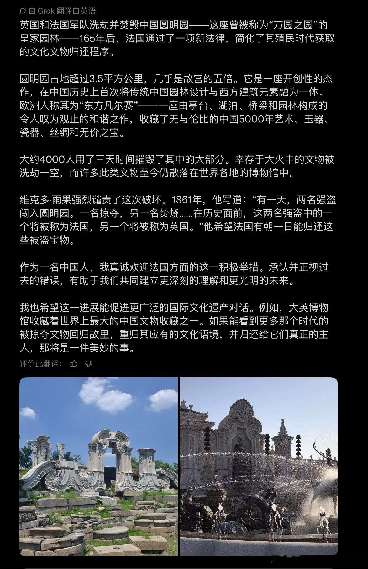 首先,这条法律主要是针对法国殖民时期在非洲(及其他殖民地)的掠夺物品。马克龙2017年承诺向非洲国家归还殖民时期被掠夺的文物,这次立法就是把承诺变成制度——以后不用每还一件就找议会单独立法,政府走行政程序就能处理。议会讨论全程围绕非洲殖民掠夺,贝宁的青铜器、塞内加尔的鼓、科特迪瓦的面具,没提中国。议员引用雨果那段关于圆明园的话,属于提升法案道德高度的修辞,不代表法律针对中国。