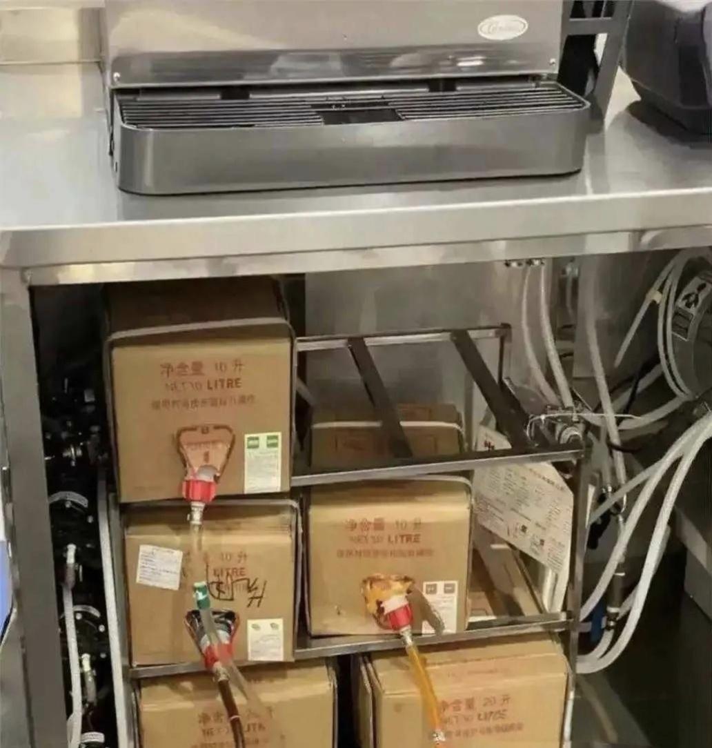 原来饮料机的内部是这样的,我敢打赌,如果饮料机以这种形式示人,销量肯定会断崖式下滑的! 这个纸盒子里面装的是密封塑料袋装的糖浆,纸盒是方便运输和存放。旁边还有二氧化碳瓶和纯净水,这三个东西同时开始工作,你的一杯饮料就好了,其实平常喝的瓶装、罐装的碳酸饮料也都这样的原理,糖浆+二氧化碳+饮用水,只是看不到罢了!