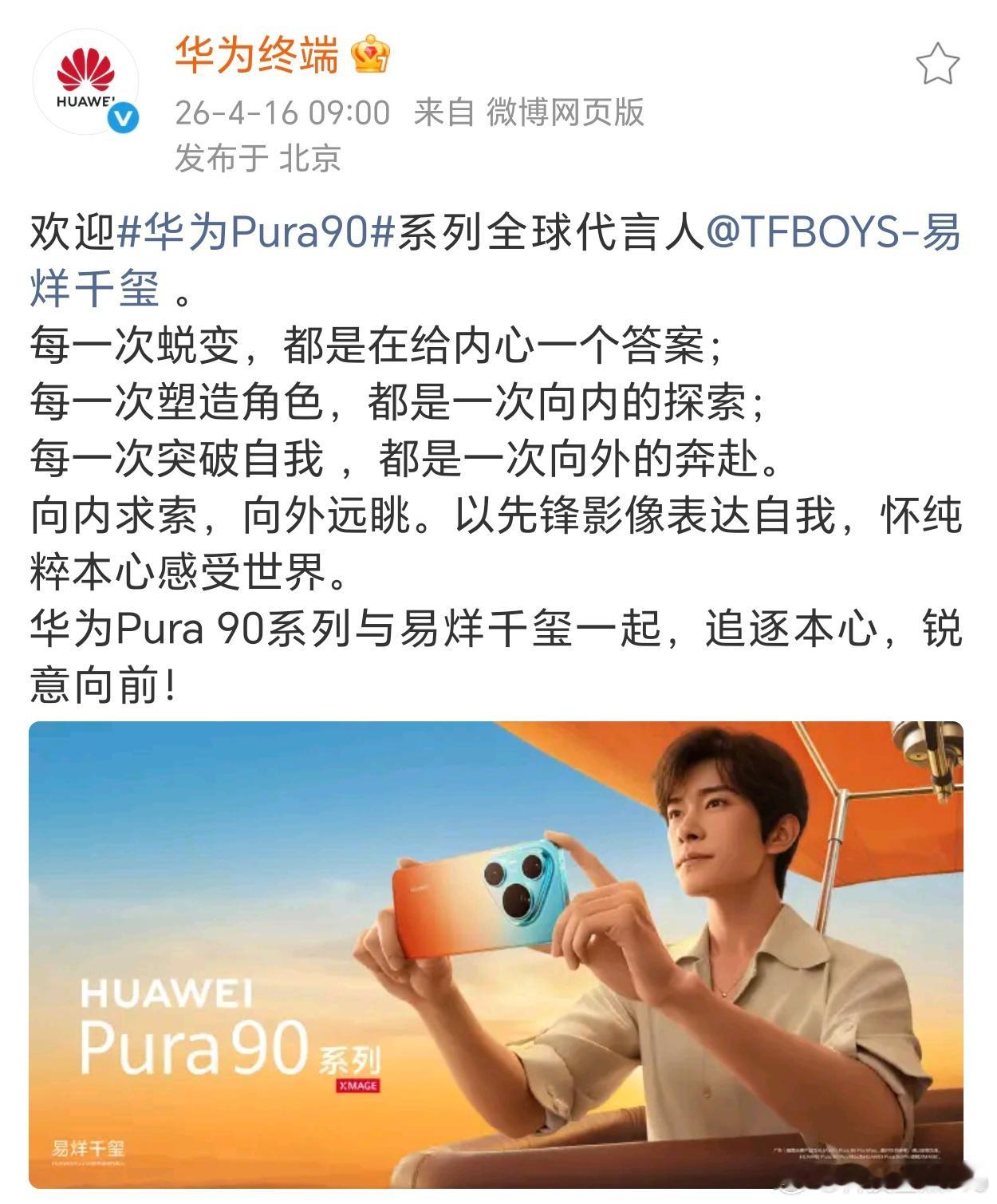 啊,易烊千玺成华为Pura90系列全球代言人了