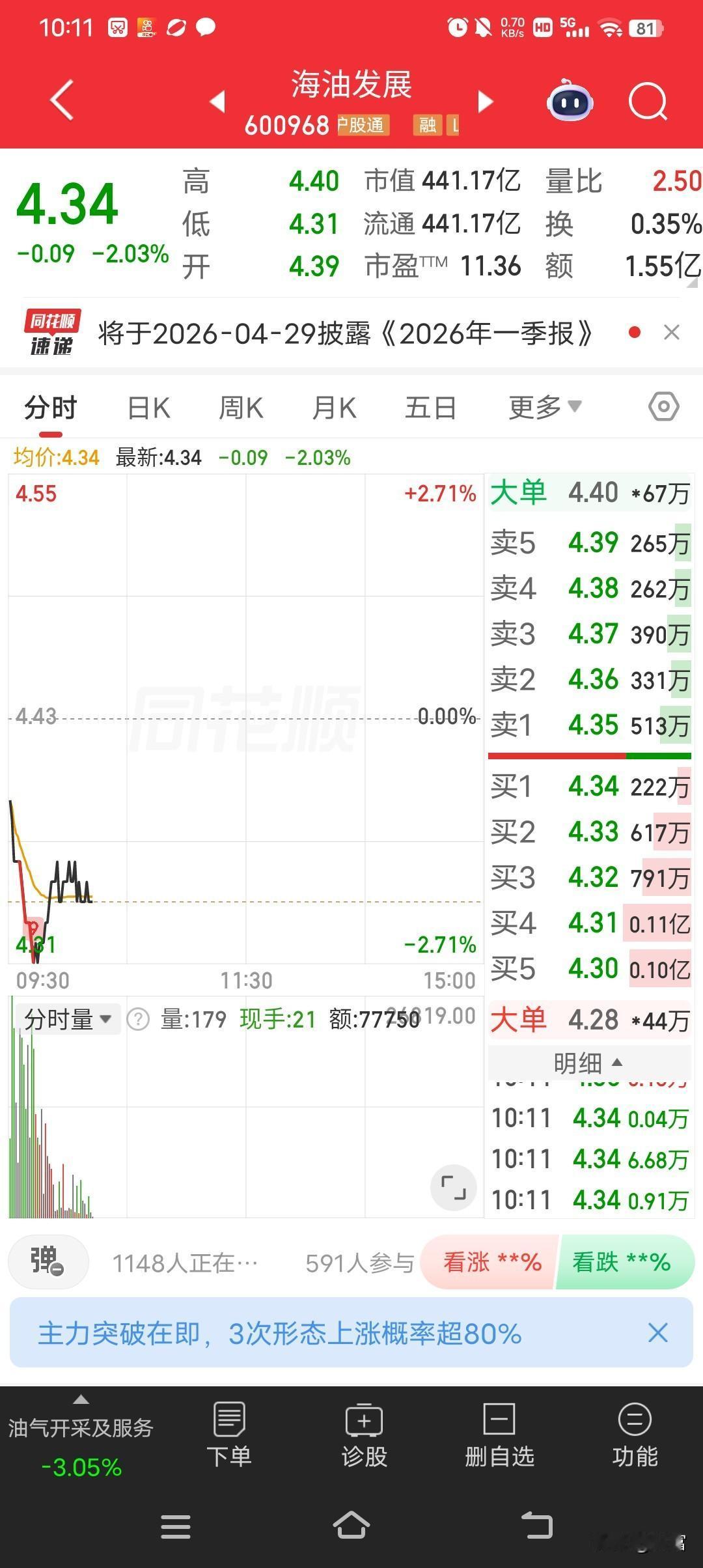 海油发展现在最新价4.35,走势看着是真弱,一直处在下跌趋势,让人心里直犯嘀咕,就盼着它能赶紧反弹。 从之前的情况看,3月26日它还收涨了0.65%,股价从去年12月23日到那时涨幅达20.78%,短期均线也有支撑。可现在这下跌趋势又让人担忧。国信证券说它能源技术服务等业务随海上油气增量稳定增长,低碳环保与数字化板块还是成长引擎,但也下调了2026 - 2027年盈利预测。希望它能快点结束这下跌趋势,来一波反弹,让股民也能松口气。