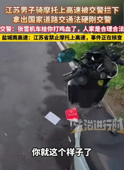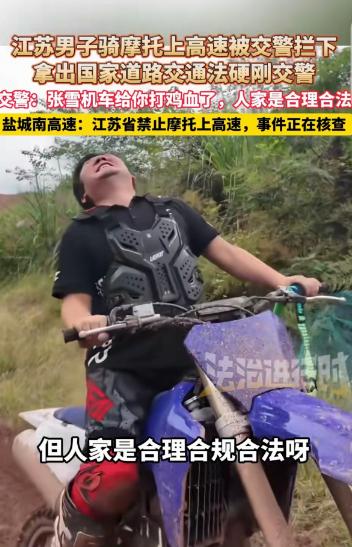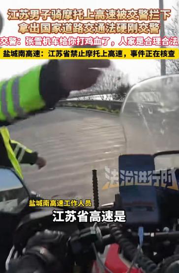 “地方法规大还是国家法律大?”江苏,一男子骑着摩托车上高速,被交警拦下,他不认错还嘴硬,拿出《道路交通法规》硬刚交警,交警一看男子执迷不悟,也没惯着他,对他义正言辞:是不是张雪机车给你打鸡血了?中国摩托车又行了?人家是合理合规合法呀。男子还是不服气:我也是合理合规合法!结果悲剧了。高速回应:江苏省禁止摩托车上高速,事件正在核查。 2026 年摩托车管理新规落地后,全国多地进一步明确了摩托车高速通行权限,而江苏盐城近期发生的一起执法纠纷,却将 “国家法律与地方法规的适用边界” 再次推至公众视野。 不同于普通的交通违规事件,该事件不仅涉及车主对法规的认知偏差,更暴露了部分驾驶人对地方细化规定的忽视,甚至牵扯出执法方式的合理性争议,相关话题快速冲上社交平台热搜,引发全网对交通执法与法规适用的深度讨论。 4 月 14 日,《法治进行时》独家报道了这起发生在盐城某高速入口的执法冲突,结合高速部门官方回应及执法记录仪完整视频,事件全貌逐步清晰。 根据《中华人民共和国道路交通安全法》第 38 条明确规定,车辆、行人应当按照交通信号通行,遇有交通警察现场指挥时,应当按照交通警察的指挥通行。 这一法条成为事件中车主坚持自身 “合规” 的核心依据,也让不少网友产生疑问:为何国家法律未禁止,地方却能出台禁令?事实上,这也是很多驾驶人普遍存在的认知误区。 将国家法律的 “原则性规定” 与地方法规的 “细化性要求” 对立起来,忽视了二者的互补关系。 结合 2026 年摩托车管理新规,江苏被列入全国 13 个全域禁止摩托车驶入高速公路的省份,相关规定已通过官方渠道公示,并在全省所有高速入口设置了统一的禁令标志,不存在信息不透明的情况。 此次事件中的涉事车主,正是陷入了对法规的片面认知误区。 盐城涉事高速入口车流平稳,就在交警正常疏导交通的过程中,涉事男子驾驶摩托车无视入口处红圈白底的禁行标志,径直向高速主线疾驰。 交警第一时间上前规范示意停车,男子却非但没有减速,反而猛拧油门试图强行冲卡,完全无视执法指令与现场安全警示。 为避免男子冲卡引发交通事故,保障其本人与过往车辆的通行安全,交警果断使用交通锥进行拦截,经过多次规范示意,最终将涉事摩托车安全截停。 面对男子的对峙,交警始终保持冷静,全程未出现情绪化回应,先是明确告知男子,高速入口的禁行标志属于法定交通信号。 其无视标志冲卡的行为,已违反《道路交通安全法》第 38 条的规定,同时耐心解释了江苏全域禁摩上高速的地方性法规依据。 在男子反复执迷不悟,坚称自己 “合理合规合法” 的情况下,交警反问其 “是不是张雪机车给你打鸡血了?中国摩托车又行了?人家是合理合规合法呀”,这句话也成为后续舆论争议的核心之一。 而事件中被提及的网红 “张雪机车”,此前曾因甘愿舍弃 10% 的销量,拒绝向驾龄不满一年的新手出售大排量摩托车,获得了公安部交管局的公开力挺,其骑行视频中也反复强调,需严格遵守各省份的通行规定,绝不闯入禁行区域。 涉事男子仅看到视频中的骑行画面,却忽视了合规前提,盲目跟风的行为,也成为网友热议的焦点。 最终,因涉事男子拒不配合执法,甚至试图再次冲卡,交警依法对其作出罚款 200 元、记 3 分、暂扣摩托车的处罚,同时责令其从最近出口驶离高速,整个处罚流程完全符合交通违法处罚规范。 直到拿到处罚决定书,男子才停止争执,配合完成了相关处罚流程。 如果各位看官老爷们已经选择阅读了此文,麻烦您点一下关注,既方便您进行讨论和分享,又能带来不一样的参与感,感谢各位看官老爷们的支持!