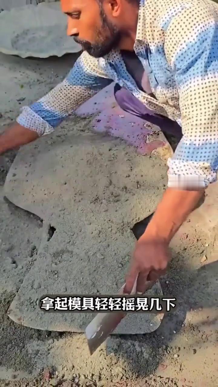大家注意看,这操作一眼看过去像在做蛋糕,其实是在做彩色水泥预制件。 ·先把一大盆红色油漆均匀倒进模具里。很多人以为这只是为了好看,但其实在干两件事:上色,顺便让表层更细腻,更像成品面。 ·紧接着把地上的水泥一铲一铲倒进模具里,边撒边铺匀,让水泥把模具每个角落都填满。注意到没有,中途还放了一圈铁丝进去当骨架。 ·问题来了,加这根铁丝有什么用?很简单,水泥这种材料抗压强,但抗拉差,一掰一磕最容易从薄弱处开裂。铁丝就像给它塞了根筋,让它不容易断,也更耐用。 ·然后再浇上一层水,拿起模具轻轻摇晃几下。这一步其实是在做排气和找平,让水泥浆更顺的流进细缝里,把小气泡赶出来。 ·接着再撒一层干水泥,让它把表面的水分吸走,形成更密实的面层。 ·最后用刮板把多余的水泥刮掉,再把表面抹的光光滑滑。 ·等它出凝了,把模具搬到干净的地方,一翻面慢慢脱模,咔一声取出来。 就会发现,一件带着红色表层,纹理清晰,边角完整的艺术品就成了。