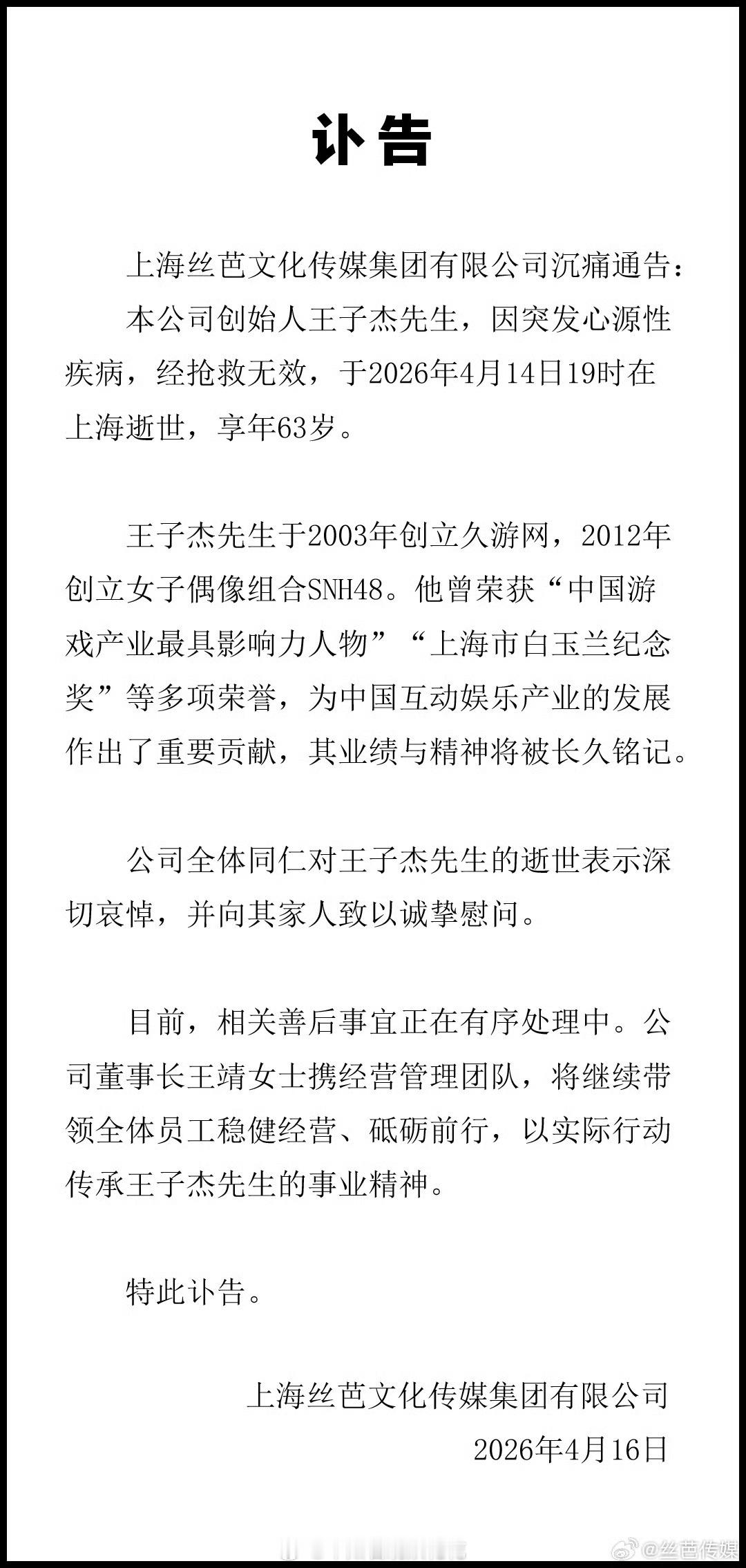 丝芭发布了王子杰去世的讣告丝芭发布讣告丝芭总裁去世