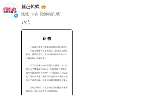 王子杰讣告刚刚,发布王子杰讣告,因突发心源性疾病,经抢救无效,于2026年4月