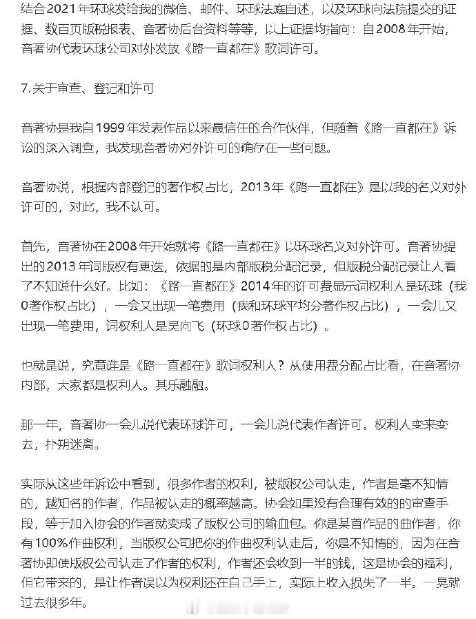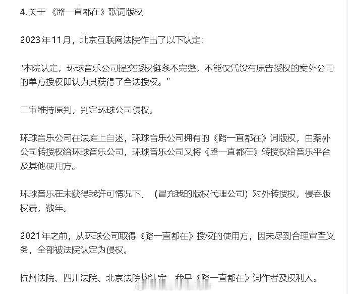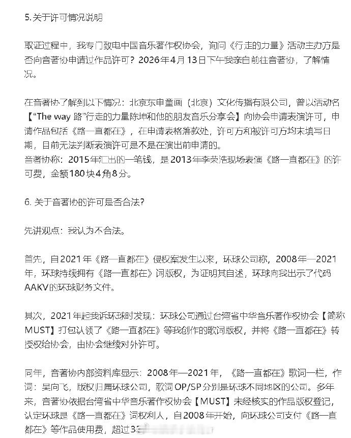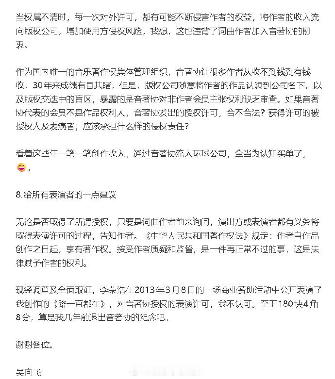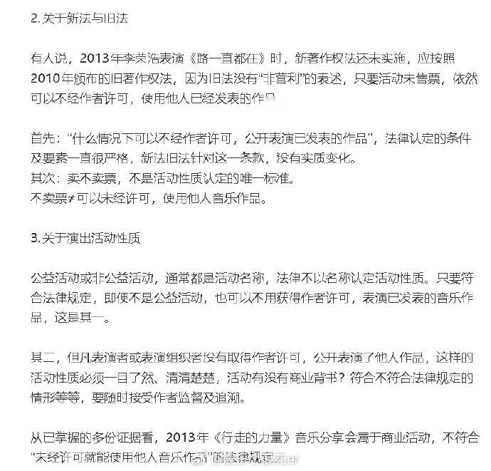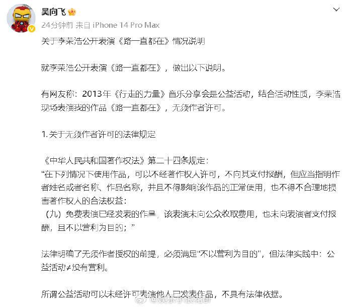 吴向飞发李荣浩相关情况说明 吴向飞再发长文⬇️ 1、否认李荣浩在公益活动未经许可表演是合法的:“所谓公益活动可以未经许可表演他人已发表作品,不具有法律依据。 ”2、不卖票≠可以未经许可,使用他人音乐作品。3、2013年《行走的力量》音乐分享会属于商业活动,不符合“未经许可就能使用他人音乐作品”的法律规定。4、杭州法院、四川法院、北京法院均认定,吴向飞是《路一直都在》词作者及权利人。5、吴向飞认为音著协的许可不合法:看着这些年一笔一笔创作收入,通过音著协流入环球公司,全当为认知买单了,😄。