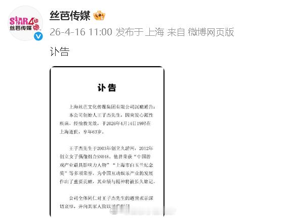 丝芭传媒发王子杰讣告 丝芭传媒发布讣告↓