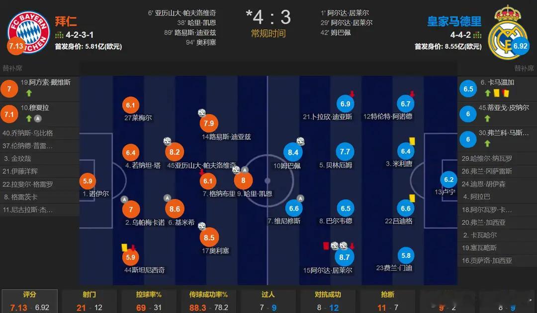 欧冠名局再现!拜仁三落三起逆转绝杀 双杀皇马 总比分6-4淘汰十人皇马北京时间4月16日凌晨3点,欧冠1/4决赛次回合,拜仁主场迎战皇马,首回合皇马主场1-2不敌拜仁。上半场,诺伊尔失误送点式大礼,居莱尔吊射率先破门,基米希角球助攻帕夫洛维奇头球扳平,居莱尔任意球直接破门再度领先,于帕梅卡诺助攻凯恩转身抽射再扳一城,维修斯助攻姆巴佩推射得分,皇马半场3-2领先(总比分4-4);下半场双方激烈对攻,第86分钟替补上场的卡马文加因不归还球权染黄,两黄变一红被罚下,皇马少打一人,第89分钟迪亚斯世界波破门,拜仁第三次扳平(总比分5-4),补时奥利斯世界波终结比赛。最终拜仁4-3击败皇马,总比分6-4双杀对手晋级欧冠四强,半决赛将对阵卫冕冠军巴黎。孔帕尼本场祭出4231,凯恩突前,格纳布里居中,迪亚斯、奥利斯两翼,基米希与帕夫洛维奇后腰,斯坦尼西奇、于帕梅卡诺、塔、莱默尔后防,诺伊尔守门,首发身价5.81亿欧元;阿韦洛亚排出442,维修斯、姆巴佩双前锋,中场居莱尔、巴尔韦德、贝林厄姆、迪亚斯,后防门迪、吕迪格、米利唐、阿诺德,卢宁守门,首发身价8.55亿欧元。皇仁大战再度上演欧冠经典!皇马客场三次领先,拜仁却始终没有放弃,在开局不利的情况下三次追平,最后时刻两位边锋世界波连击完成绝杀。拜仁后防线表现低迷,诺伊尔与斯坦尼西奇评分不及格,进攻端三叉戟全部破门扛起球队。皇马方面,居莱尔梅开二度发挥出色,姆巴佩也状态在线,可惜卡马文加替补登场后无脑染红,让球队陷入绝境最终出局。个人认为卡马文加早该被清洗,足球赛场实力为王,没有实力,玄学也毫无意义。拜仁晋级实至名归,全场控球率69%,射门21次射正9次;皇马射门12次射正5次。欧冠四强身价