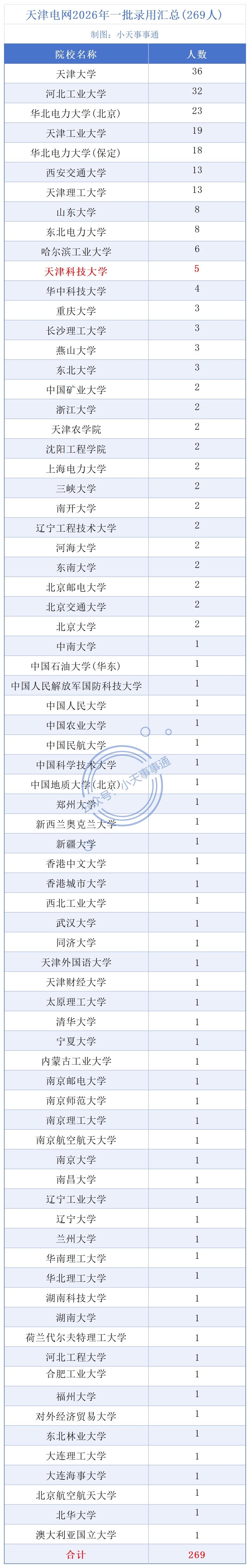 天津电网269人录用名单出炉,本地高校霸榜! 天津电网2026年一批录用269人名单正式公布,本地高校包揽前二,天津籍高校统治力拉满,地域优势简直太明显! 🏆 榜单TOP级实力 • 天津大学:36人人数最多,本土工科天花板实至名归 • 河北工业大学:32人紧随其后,211高校还是认可度高 • 华北电力大学(北京):23人稳居第三,电力专业硬实力拉满 • 天津工业大学:19人,本地双一流理工类院校 📊 本地高校绝对优势 除以上三所,天津其他院校全面开花: • 天津理工大学13人、天津科技大学5人,稳稳占据榜单中游 • 南开大学、天津农学院等本地高校也均有录用,天津高校录用人数遥遥领先外地院校 天津电网作为本地能源巨头,偏爱本土优质工科高校已成惯例。天大、河工大、华电等院校的电气、动力等专业与电网岗位高度匹配,加上本地学生归属感强、留津意愿高,自然成为招录首选! 天津电网不仅收入高,福利待遇也不是一般的企业能比的,而且不担心失业,妥妥的国企天花板!