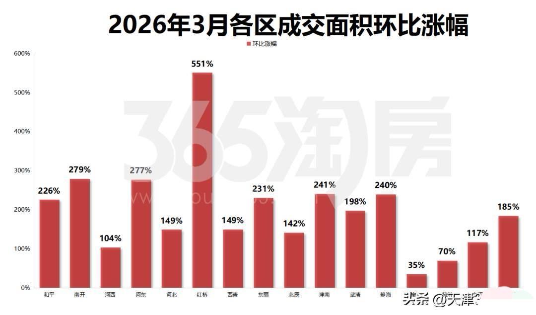 天津新房3月量价齐涨,半数区域成交量涨幅超200%! 天津新房3月成交量暴涨,共成交面积64万㎡,环比暴涨178.3%,创近一年峰值,这波小阳春力度还挺大。3 月新房成交均价18298元,环比上涨5.6%,创近10个月新高。 来看一下天津3月新房成交面积完整排名: 1. 滨海新区:14.6万㎡(+240%) 2. 西青:7.4万㎡(+149%) 3. 武清:6.5万㎡(+198%) 4. 津南:5.8万㎡(+241%) 5. 东丽:4.7万㎡(+231%) 6. 河东:4.4万㎡(+277%) 7. 河西:3.6万㎡(+104%) 8. 北辰:2.7万㎡(+142%) 9. 宝坻:2.6万㎡(+117%) 10. 南开:2.6万㎡(+279%) 11. 河北:2.5万㎡(+149%) 12. 红桥:2.3万㎡(+551%) 13. 静海:2.2万㎡(+240%) 14. 宁河:1.1万㎡(+70%) 15. 蓟州:1.1万㎡(+185%) 16. 和平:0.2万㎡(+226%)