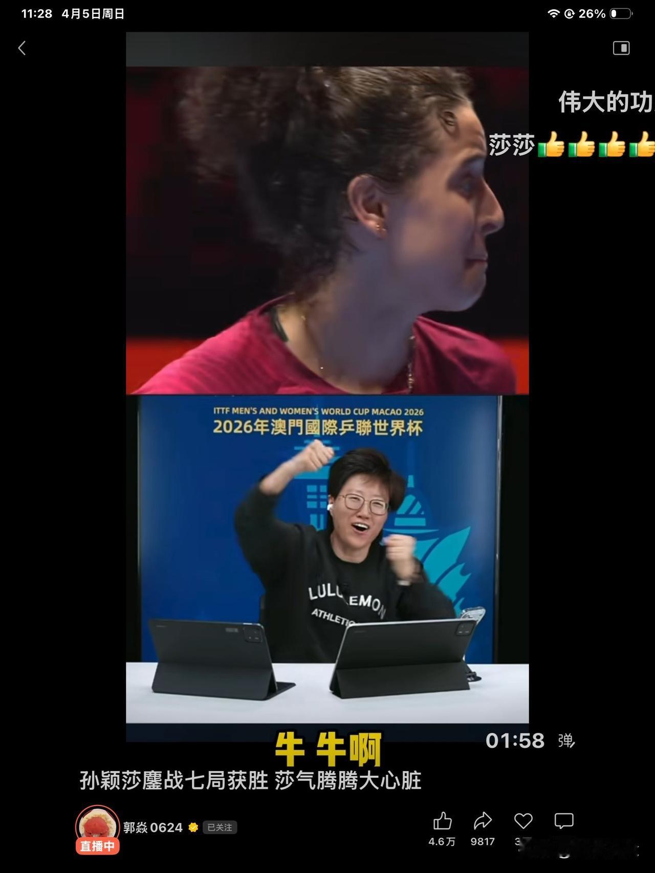 看乒乓伤感情。[打脸][打脸][打脸] 以前老话说: 谈钱伤感情。 现在是: 看乒乓伤感情。 我喜欢莎莎, 我一个闺蜜喜欢樊振东, 所以我们互相之间,绝对不说乒乓球, 否则一定会翻脸, 几十年的友情如烟。 [打脸][打脸][打脸] 庆幸的是我最好的闺蜜, 她喜欢王楚钦。 所以我和她不会打架。。。。。[大笑][大笑][大笑] 当然最开心的是我家木头, 他喜欢莎莎也喜欢王楚钦。 [大笑][大笑][大笑] 只是他开心的时候,不单会说: “这2个孩子人品好球技好,……”。 还会哈哈大笑的说: “让我们拥抱一下,也疯一回来庆祝一下吧。” 完了,家里有人疯啦。[大笑][大笑][大笑] 有一说一, 在我看来: “尽力尽心拼命的就是真英雄,当金牌和英雄不能共处的时候,我只敬重英雄”