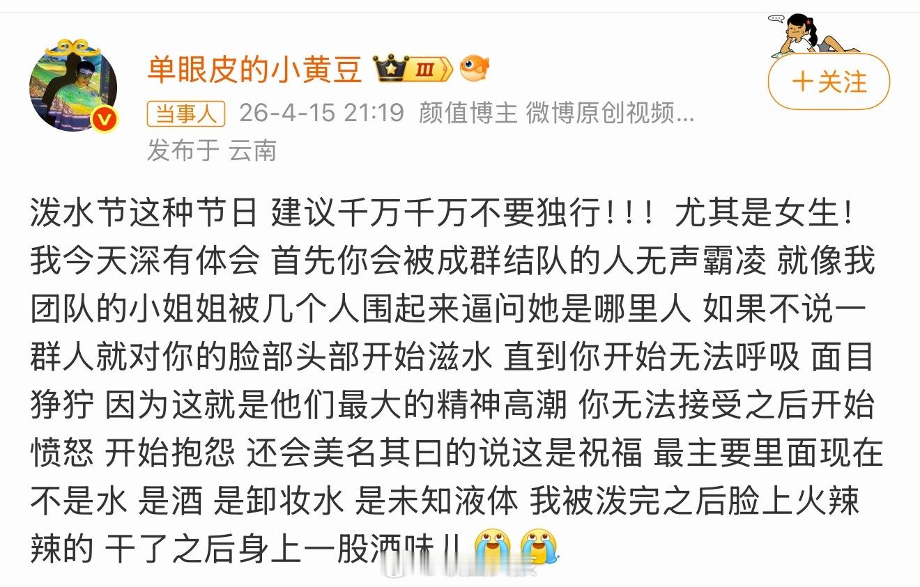 小黄豆自曝在泼水节被喷未知液体小黄豆发声:泼水节被围堵,遭喷酒精、卸妆水等不明液体,脸部刺痛、衣服留酒味,拒绝还被追着喷。打着祝福的名义,行80骚 扰之实,狂欢不是越界的借口,女生出门真的太不安全了。
