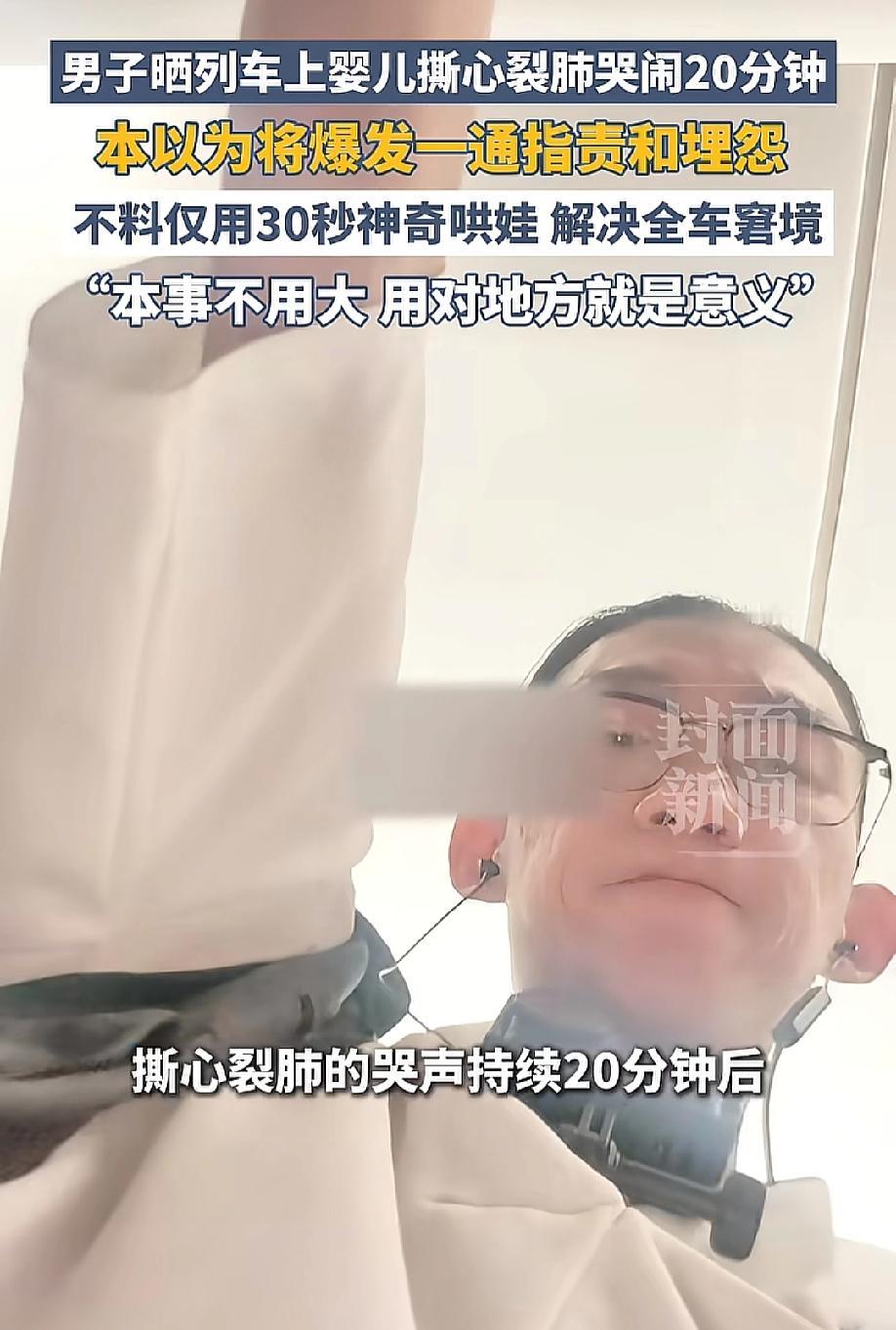 婴儿在车厢里撕心裂肺的哭了20分钟,男子忍无可忍,放下手机朝婴儿走过去,就在大家以为男子要向宝妈发脾气时,男子只说了一句“把孩子放心交给我,我有办法让孩子安静下来”。 坐火车、高铁最闹心的事儿,莫过于遇到一个撕心裂肺哭的小宝宝!尤其是那种哭起来停不下来的,能把人逼得头皮发麻,浑身冒火! 最近,一个小婴儿在车厢里哭了整整20分钟,哭声尖锐又响亮,穿透力极强,整节车厢的人都被吵得坐不住,有人皱着眉嘟囔,有人不耐烦地叹气,还有人频频瞪向抱孩子的宝妈,那眼神里全是不满,就差直接开口指责了。 而宝妈呢,急得满头大汗,手忙脚乱地又拍又哄,嘴里不停地道歉,可宝宝就是止不住地哭,哭得脸都憋红了,嗓子都快哑了,宝妈自己也红了眼眶,那种无助劲儿,看着都让人心疼。 这时候,斜前方一个穿黑色外套的男子,突然“啪”地一声放下手里的手机,猛地站起身,脸色阴沉得吓人,二话不说就朝着宝妈和婴儿的方向走过去。当时周围的人心里咯噔一下:坏了,这是忍无可忍要爆发了!肯定是要对着宝妈发脾气,甚至骂人了! 毕竟换谁也受不了,20分钟啊,不是一两分钟,任谁被这么吵着,耐心也早就被磨没了。周围的人都屏住了呼吸,有人甚至拿出手机准备录像,等着看一场“大战”,还有人小声嘀咕:“终于有人忍不住了,早该说说这个宝妈了,管不好孩子就别带出来添乱!”就连宝妈自己,也吓得往后缩了缩,低着头,手足无措,估计已经做好了被指责、被谩骂的准备。 可谁也没想到,接下来发生的一幕,直接反转了所有人的预期,甚至看哭了不少人!男子走到宝妈面前,停下脚步,脸上的阴沉瞬间褪去,语气不仅没有一丝怒气,反而还带着几分温柔,只说了一句话:“妹子,别着急,把孩子放心交给我,我有办法让孩子安静下来。” 这句话一出口,整个车厢瞬间安静了,所有人都愣住了,脸上全是难以置信的表情,刚才还准备看笑话、还在抱怨的人,全都闭了嘴,一脸疑惑地看着这个男子。宝妈也懵了,愣了好一会儿,才犹豫着把怀里哭闹不止的宝宝,小心翼翼地递给了男子。 大家都盯着男子,想看看他到底有什么本事,能让哭了20分钟的宝宝安静下来。只见男子接过宝宝,动作熟练又轻柔,仅仅过了30秒,刚才还撕心裂肺哭闹的宝宝,哭声竟然慢慢小了下来,眼睛也睁开了,好奇地看着男子,小嘴巴动了动,没过一会儿,竟然真的完全安静了下来,甚至慢慢露出了一点笑容。 这一幕,看得所有人都目瞪口呆,刚才还不耐烦的人,脸上都露出了愧疚和佩服的表情。后来大家才知道,这个男子是一名专业的儿童摄影师,平日里经常和小宝宝打交道,哄娃的技巧早就炉火纯青。 他说,自己特别能理解宝妈带娃出行的不容易,也知道小宝宝哭闹不是故意的,要么是环境陌生害怕,要么是身体不舒服,要么是作息乱了烦躁,刚才看宝妈实在太无助,就想着伸手帮一把。这段视频传到网上后,瞬间走红,网友们纷纷点赞,直呼“这一刻,他就是全车厢的神”。 现在很多人坐公共交通,一遇到孩子哭闹,第一反应就是抱怨、指责,其实这都是起不到积极作用的做法。我不是替宝妈辩解,带娃出门,家长确实有责任尽量安抚好孩子,不给别人添麻烦。但换位思考一下,哪个宝妈愿意让自己的孩子在公共场合哭闹,让自己被人指指点点?她们不是不管,是真的管不住、没办法,那种无助和尴尬,只有带过娃的人才能懂。 这个男子,没有抱怨,没有指责,而是用自己的耐心和技巧,化解了一场尴尬,既帮宝妈解了围,也给全车厢的人换来了安宁。其实公共场合,最缺的就是这种共情和善意,而不是冷漠和指责。 现在铁路部门也在努力,就像央视网报道的,很多高铁都设置了“遛娃舱”,给孩子们提供玩耍的地方,减少哭闹,这是一种进步。但更重要的是我们每一个人的包容,多一份理解,少一份抱怨,多一次伸手,少一次指责。 宝宝哭闹不是故意添乱,宝妈也不是不负责任,有时候,一句理解的话,一个伸手的帮助,就能温暖一个人,化解一场矛盾。就像这个男子,他没有做什么惊天动地的大事,却用一个小小的善举,温暖了整个车厢,也温暖了无数网友。 (每天更新,欢迎关注,喜欢文章的可以帮忙点个赞留条评~) 对此大家有什么看法?