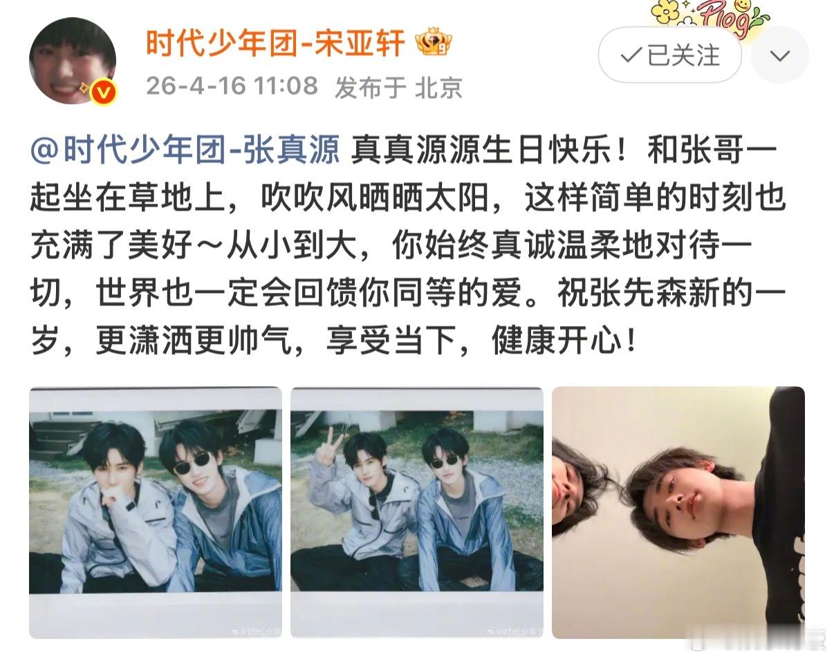 宋亚轩晒合照给张真源庆生晒合照为庆生~和张哥坐在草地上的松弛时刻太美好啦,祝张