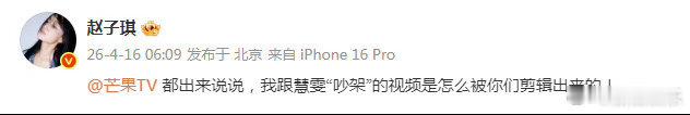 赵子琪质问芒果tv赵子琪 是逼我爆所有的料吗 4月16日凌晨,连发微博,喊话芒果TV:“我都回北京两天了,还有人不依不饶的搞我?!是逼我爆所有的料吗?”随后向官方质问后期剪辑的“吵架”视频。