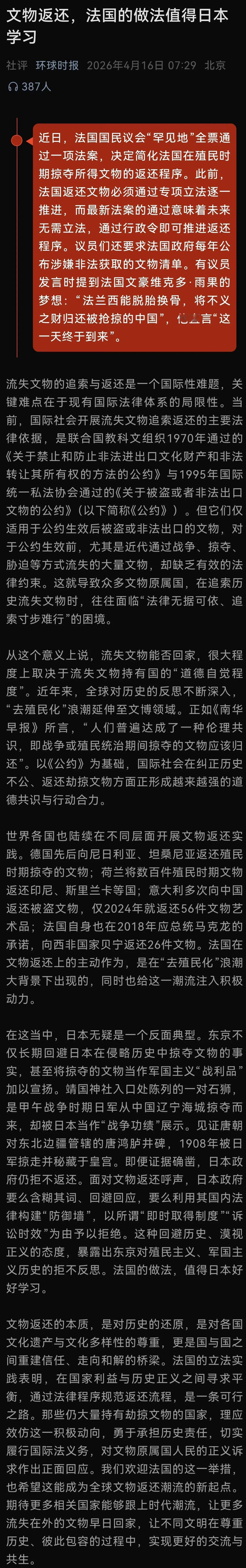 法国的举动开了个好头,但尘埃落定之前还是谨慎乐观。至于日本,就不要指望它有什么良心发现,只有强大到让它绝望才会变得乖起来。我相信这个时刻不会太远。