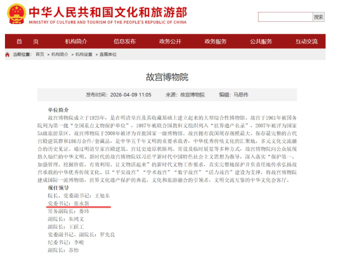 【#故宫博物院迎来新任党委书记#】近日,文化和旅游部官网显示张永新已任故宫博物院党委书记,故宫博物院官网领导一栏也同步更新。
