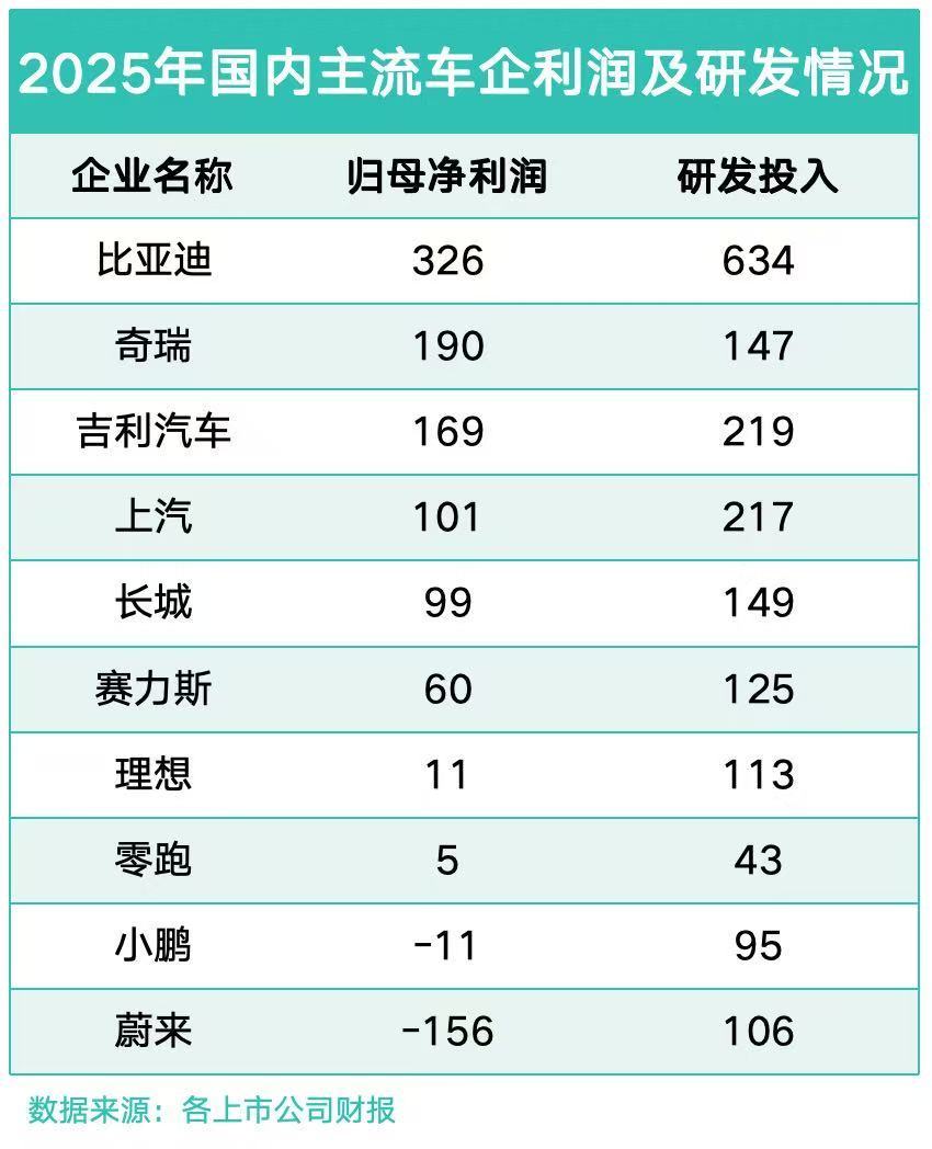 2025年国内车企年报出炉,比亚迪四项核心指标领跑:营收8040亿、销量460.2万辆、归母净利润326亿、研发投入634亿,全部排第一尤其研发投入一家顶吉利、长城、奇瑞三家之和,研发投入规模确实大。
