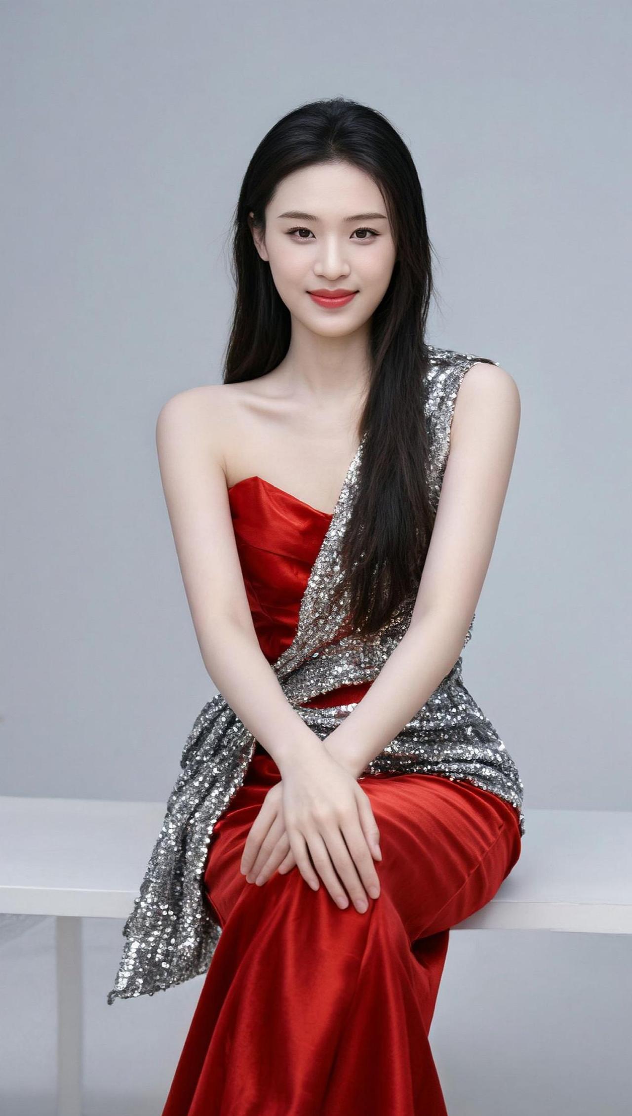 红与白的交织,像是冬日里的一场梦。她坐在那里,仿佛时间都为她静止。长裙曳地,像极了夜空中最亮的星。背景模糊,却更衬托出她的清晰与坚定。这样的画面,让人忍不住想靠近,又怕惊扰了这份宁静。
