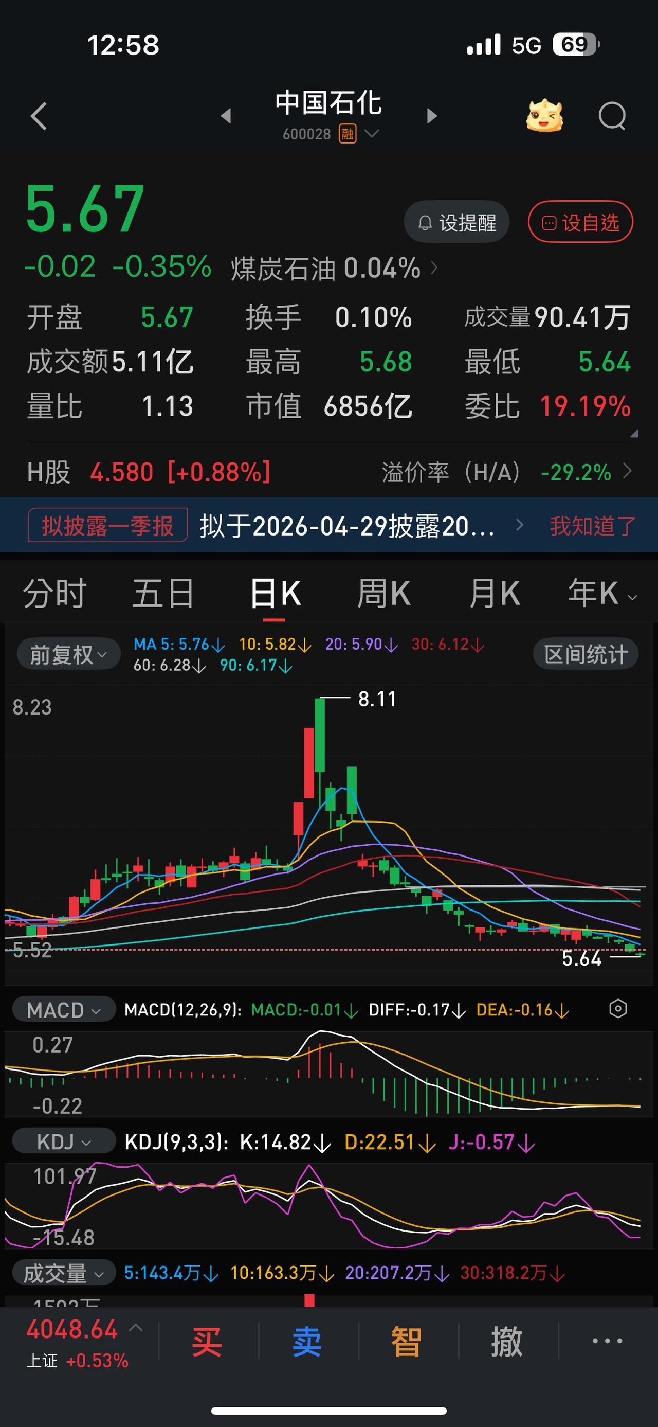 中国石化,一个多月下跌35 %!不算三月初那两个借风涨停,仍下跌10 %以上。股价已经跌破上证指数3200点时的股价。从3794点的反弹,很多亏损股价已经上升不少,而中石化仍处于下跌趋势。 这仅仅是2025年利润下降那么简单吗? 天天低开,然后低位震荡,忽而一两万手的大卖单,忽而一两万手的大买单,这种迷惑操作真的让人很无语。或许是量化对倒,在冰冷的交易中,从三两分钱中找差价。 如果是这样,还不如去买那些每天成交一两百亿的热门股,哪一个单一的机构或量化也不能兴风作浪。 中石化这种每天换手不到1 %的股,一旦被操控,那小散就是反复抄底也是白搭。 看看中石化的港股走势,再看看A股走势,这细微的差别太说明问题了。