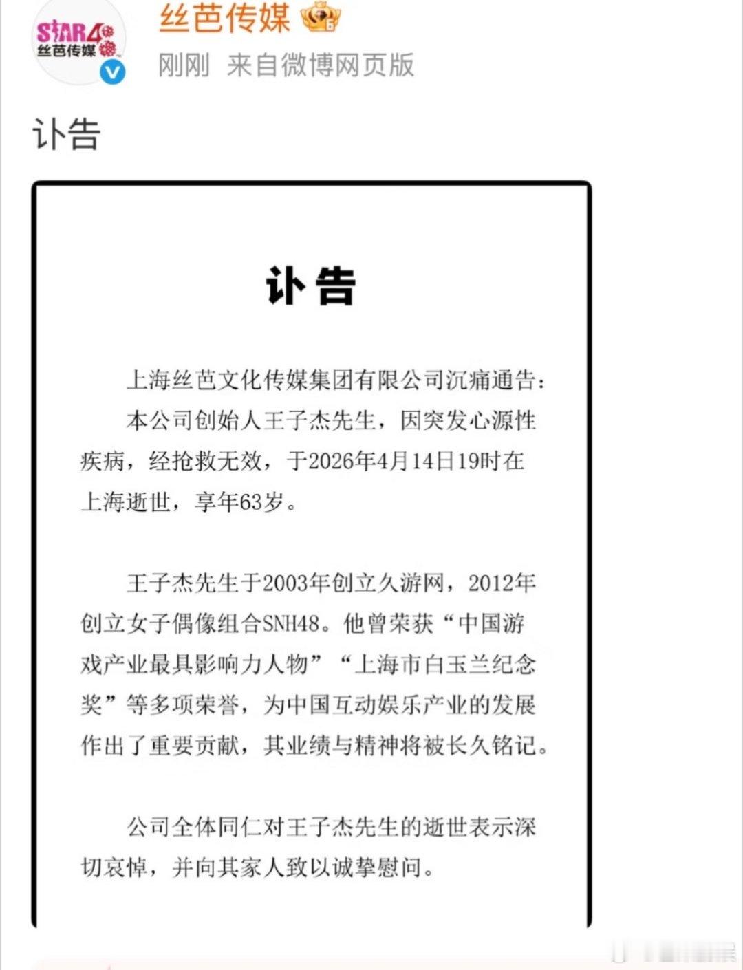 王子杰一生横跨网游与偶像经纪王子杰生平谁的青春没有王子杰的印记?一边是当年火遍全网的《劲舞团》,承载了一代人的网吧回忆;一边是撑起内娱女团半壁江山的SNH48,彻底改变了内娱偶像格局。他将日系养成模式成功本土化,剧场公演、年度总选等玩法至今影响行业。如今先生离去,一个时代悄然翻篇,感谢他为文娱行业带来的探索与创新。