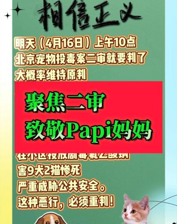 明天北京宠物投毒案二审宣判,致敬Papi妈妈 明天4月16日十点,北京宠物投毒案二审判决。 纵使大概率维持原判,精神赔偿难以支持。 感谢Papi妈妈漫长的坚守, 为毛