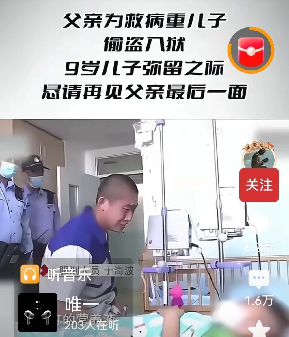 父亲为救病重的儿子去盗窃,结果入狱了。 儿子病重了,奄奄一息,即将离世。出于人道主义关怀,警方让父亲到医院去与病重的儿子告别。 儿子稚气未脱,稚嫩的话语,让人不禁泪流满面。 父亲是为了病重的儿子去盗窃,出于这方面的考虑,量刑应该是酌情处理,会轻一些吧?!