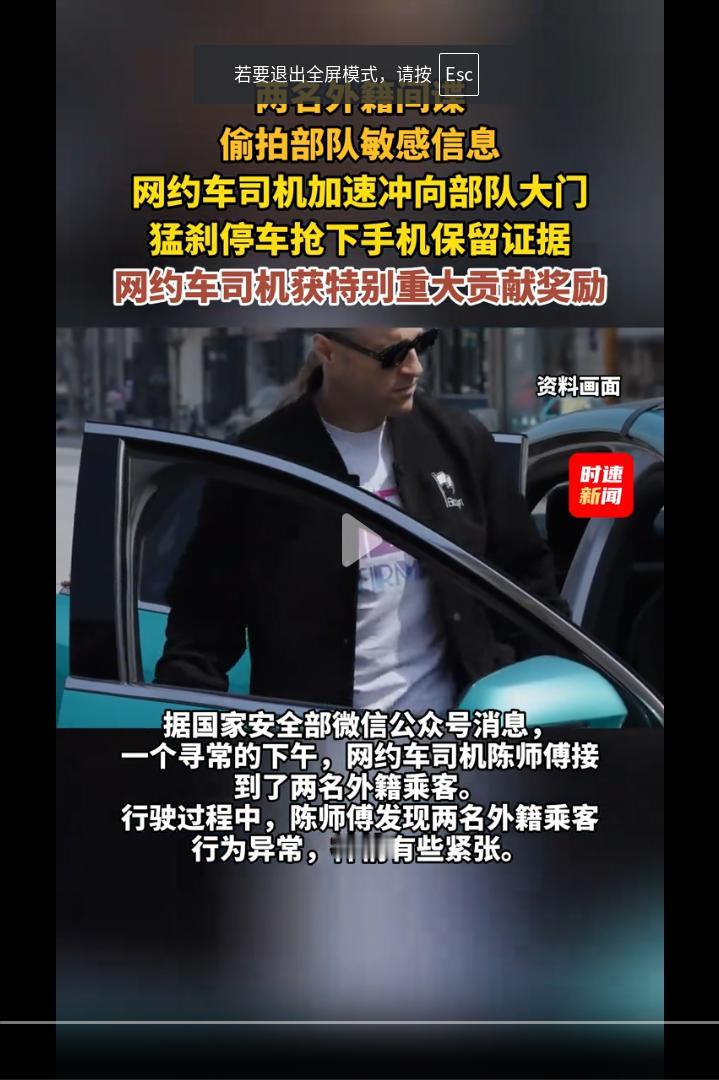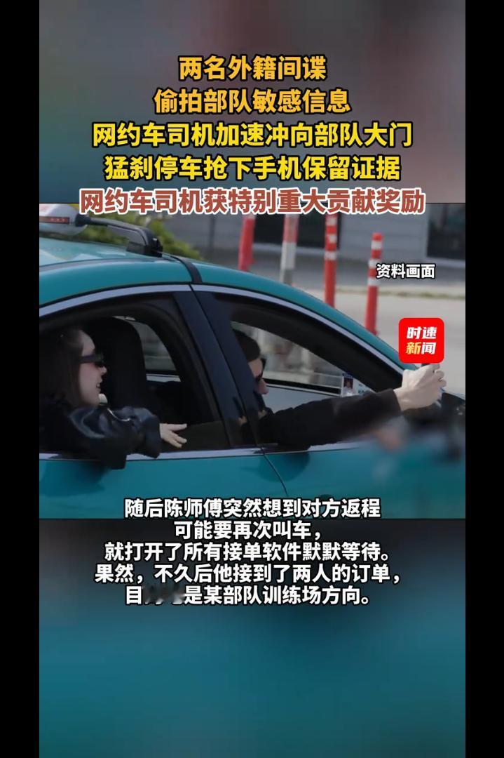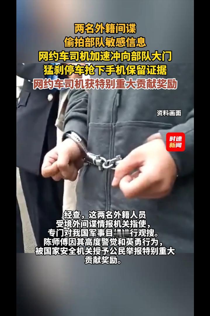 这就是人民群众的力量,让外国间谍无处遁形!两名外籍间谍,竟然妄想通过网约车作为掩护,偷拍我国某部队的敏感信息。然而,他们做梦也没想到,自己的一举一动,早已被一位警觉的网约车司机看在眼里,更想不到这位司机接下来的操作,简直是“教科书级”的擒敌范本! 陈师傅是一名网约车司机,那天接上了两名外籍乘客。 这俩人一上车就神色慌张,目的地也奇奇怪怪,是一处军事管理区,部队的营房。 陈师傅心里就犯起了嘀咕:这俩人,不太对劲。 到了地方,两人下车,鬼鬼祟祟地对着部队大门方向就是一顿猛拍,手机快门声在安静的环境里格外刺耳。司机师傅这下彻底明白了:这俩是间谍!他不动声色,悄悄记住了两人的体貌特征和谈话中的只言片语,心里暗暗做了决定。 陈师傅心想这个地方位置较偏,两人估计一会还得叫网约车,于是他打开了所有的约车软件,等两个人再次约车。 果然,没过多久,这两个间谍又通过平台叫了陈师傅的车。陈师傅一看订单,知道机会来了!他没有慌张,而是冷静地接单,平稳地开到指定地点。 两人上车后,故技重施,再次要求前往另一处军事目标-一处军事训练场附近。 陈师傅不慌不忙,等两个人上了车关上车门。司机师傅眼神一凛,突然猛打方向,一脚油门踩到底!车子发出刺耳的轰鸣,像一头愤怒的雄狮,直直地朝着部队大门冲了过去! 两名间谍瞬间吓得脸色煞白,魂飞魄散,赶紧去删除手机里的照片。 就在即将撞上大门的一刹那,司机师傅展现出惊人的驾驶技术,一个精准的急刹车!轮胎与地面剧烈摩擦,发出刺耳的声响,车子稳稳地停在了哨兵面前。 还没等两个间谍反应过来,司机师傅闪电般转身,一把夺过他们紧握在手里的手机! 然后迅速摇下车窗,对着已经警觉、荷枪实弹跑过来的哨兵大喊:“这两人是间谍!手机里有他们偷拍的照片!” 整个过程行云流水,一气呵成! 事后经过有关部门鉴定,那两部手机里,存有大量涉军敏感位置、设施照片以及相关地理信息,一旦泄露,后果不堪设想。这位勇敢机智的网约车司机,凭一己之力,为国家避免了重大损失,立下了汗马功劳! 最终,这位司机师傅获得了“特别重大贡献”级别的奖励。 此事发生后,引发网友热议,有的网友说,全民反谍,人人有责,为司机的爱国行举点赞! 也有的说,全民反间谍,一个都跑不了!高度警惕!司机师傅做的太好了! 还有的说,现今国际环境不好希望媒体定期重复报道这类事件。加深老百姓风险意识! “国家安全,人人有责”绝不是一句空话。敌人可能就隐藏在日常的每一次接单、每一次擦肩而过中。 维护国家安全,需要我们每一个人付出努力和行动,只有我们每一个人面对可疑情况时敢于挺身而出,才能形成真正的“人民防线”。 哪有什么岁月静好,不过是有人在我们看不见的地方负重前行,也有人在我们就站在身边的平凡岗位上,突然那一刻,化身成了守护万家灯火的利刃。 为这位司机点赞,也希望这样的平民英雄越来越多,让任何心怀不轨的势力,一踏上这片土地就陷入人民战争的汪洋大海! 国家安全,人人有责;人人尽责,则国家永安。