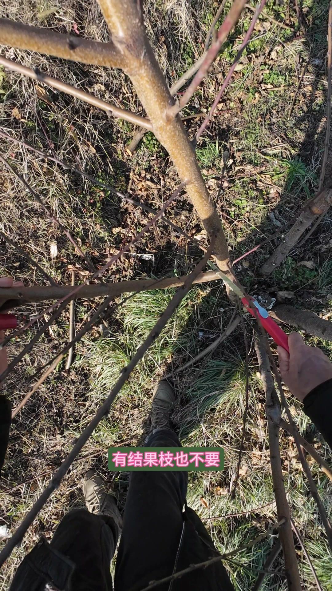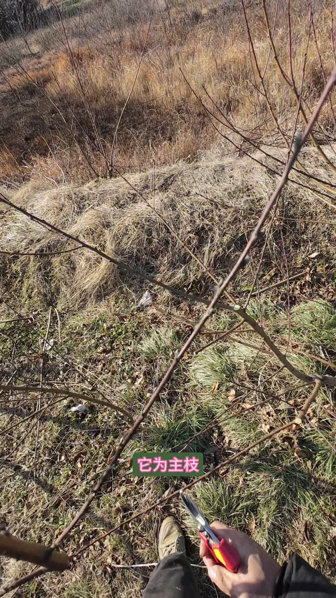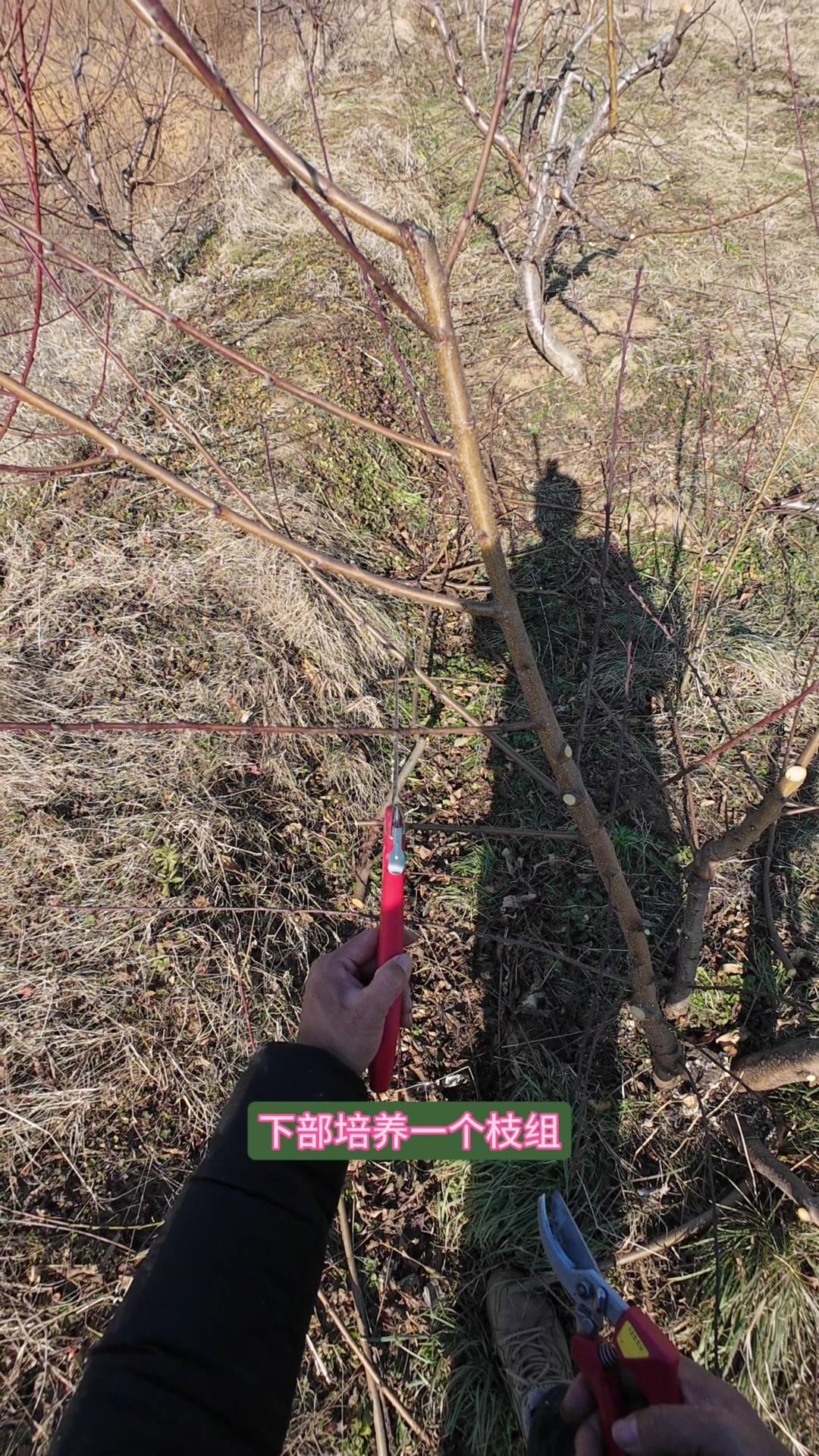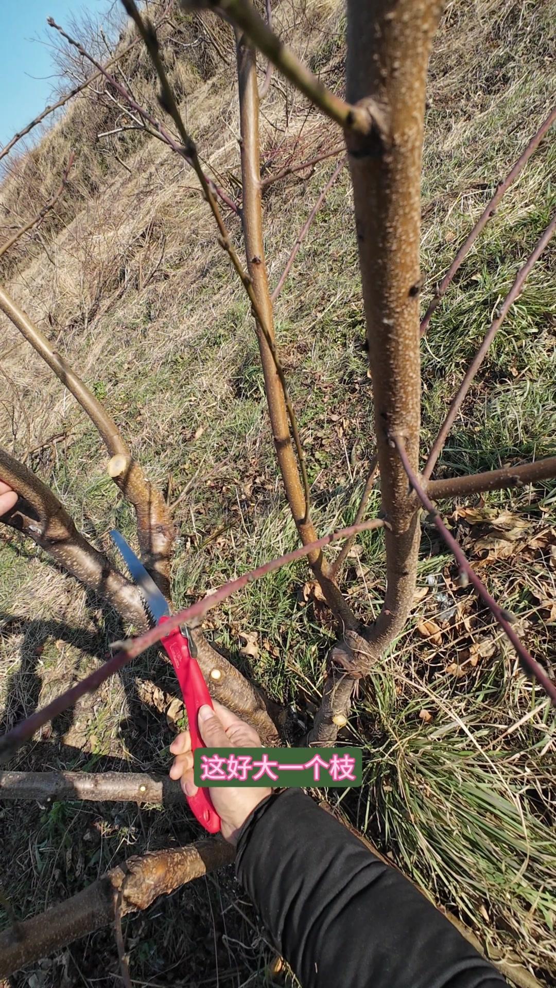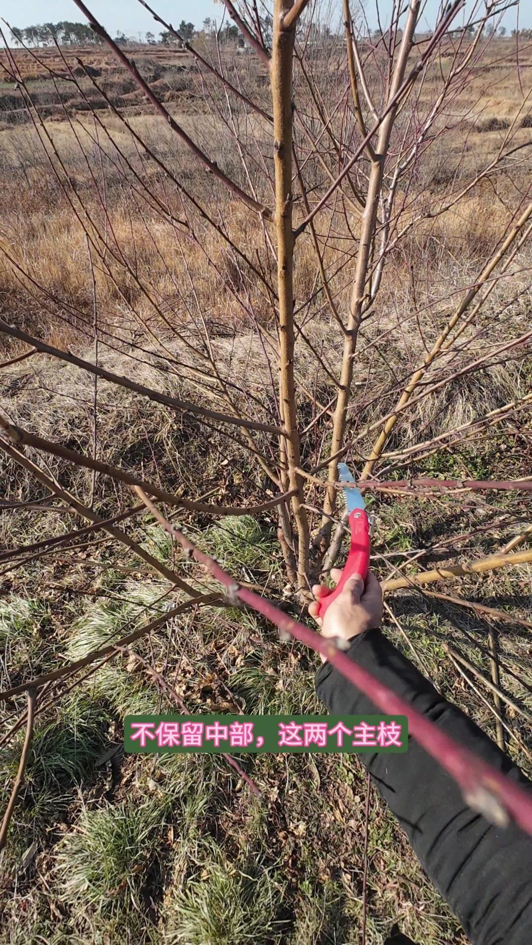 开心型小桃树修剪方法(44)📝5步教你桃树开心型修剪,来年结果翻倍! 这棵桃树修剪目的主要是定骨架,有多个主干,可以培养成开心型。在中部有两个直立的主枝,快速拉伸又遮挡其他侧枝的光线,必须下狠手,今年不锯,明年是个大麻烦,必须给它锯掉。 中部这个大的主枝在中间有点碍事,当断不断以后更乱,这好大一个枝,剪除中心枝打开了空间。它为主枝,这个位置比较好,和主枝竞争的枝条必须剪掉,下部枝组保留,结一年果,上面有优质的结果枝,保留结果枝回缩,确保产量。 这是主枝延伸头,这个主枝朝南,不能让它这么高,必须给它低高度。选定它为主枝,竞争枝剪掉,保留结果枝,与主枝竞争的枝条剪掉。这个枝有些直立,打开角度,清理好主枝延伸头,保持单枝延伸,重叠枝剪掉。 看这个主枝的修剪,出现了一个竞争枝,主枝产生了竞争,有结果枝也不要竞争枝,第二背上枝剪掉,下部培养一个枝组。原先预留的主枝延伸头角度直立,没有空间了,换个头打开角度,保留结果枝。 共保留四大主枝,保留一定产量,是一个侧枝,保留临时结果,结完果以后,明年有下部侧枝再进行压缩,结完果之后可以去掉。这是很好的一个树形。