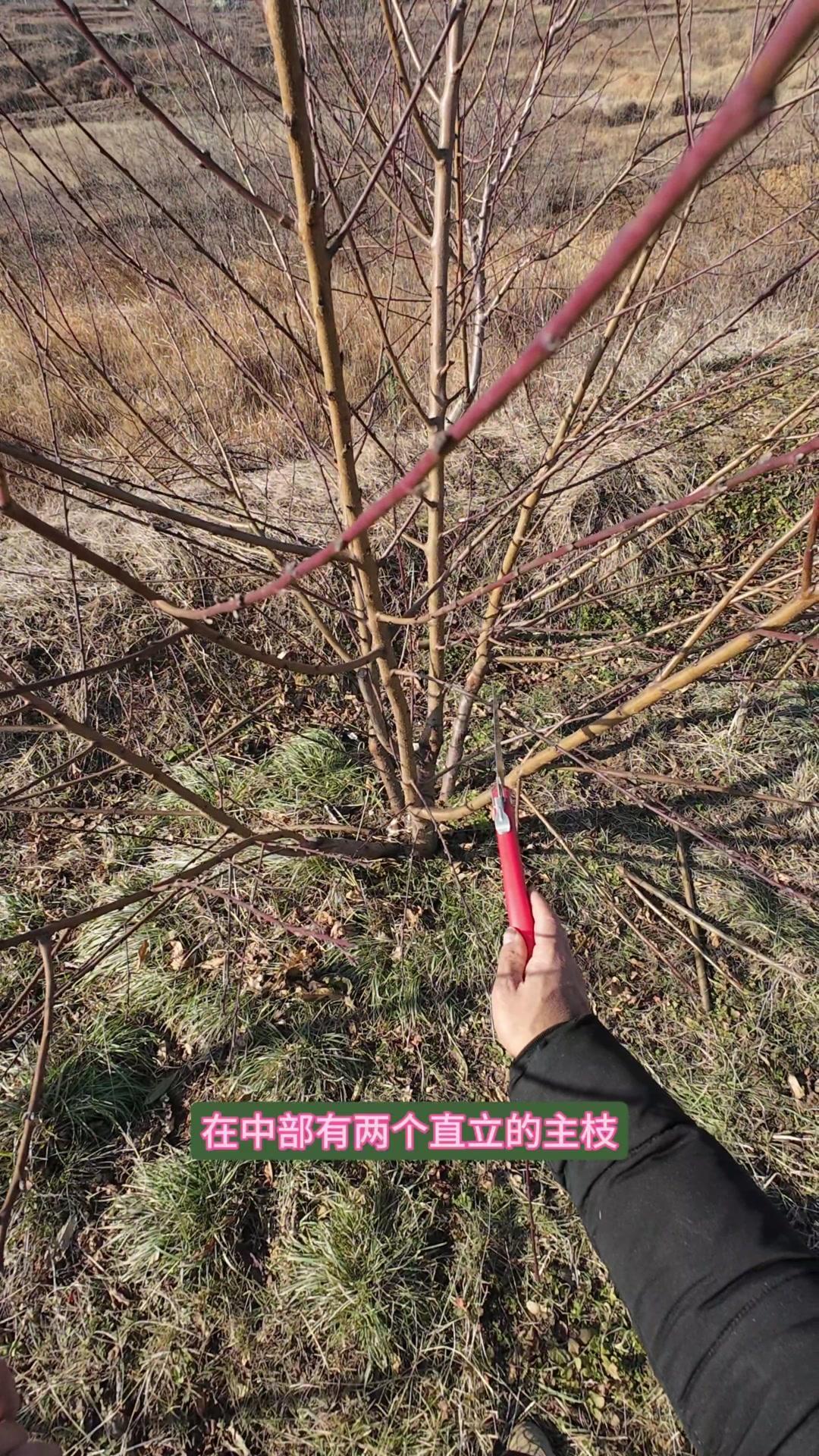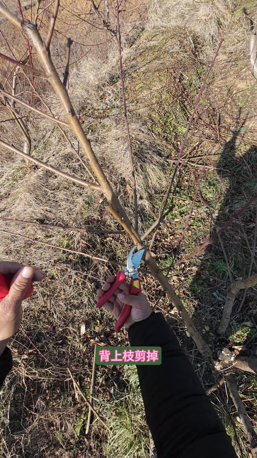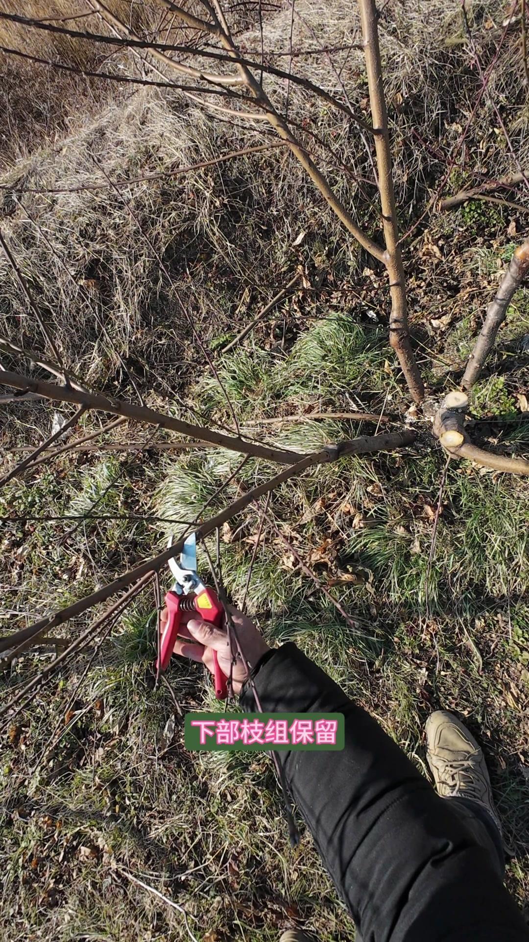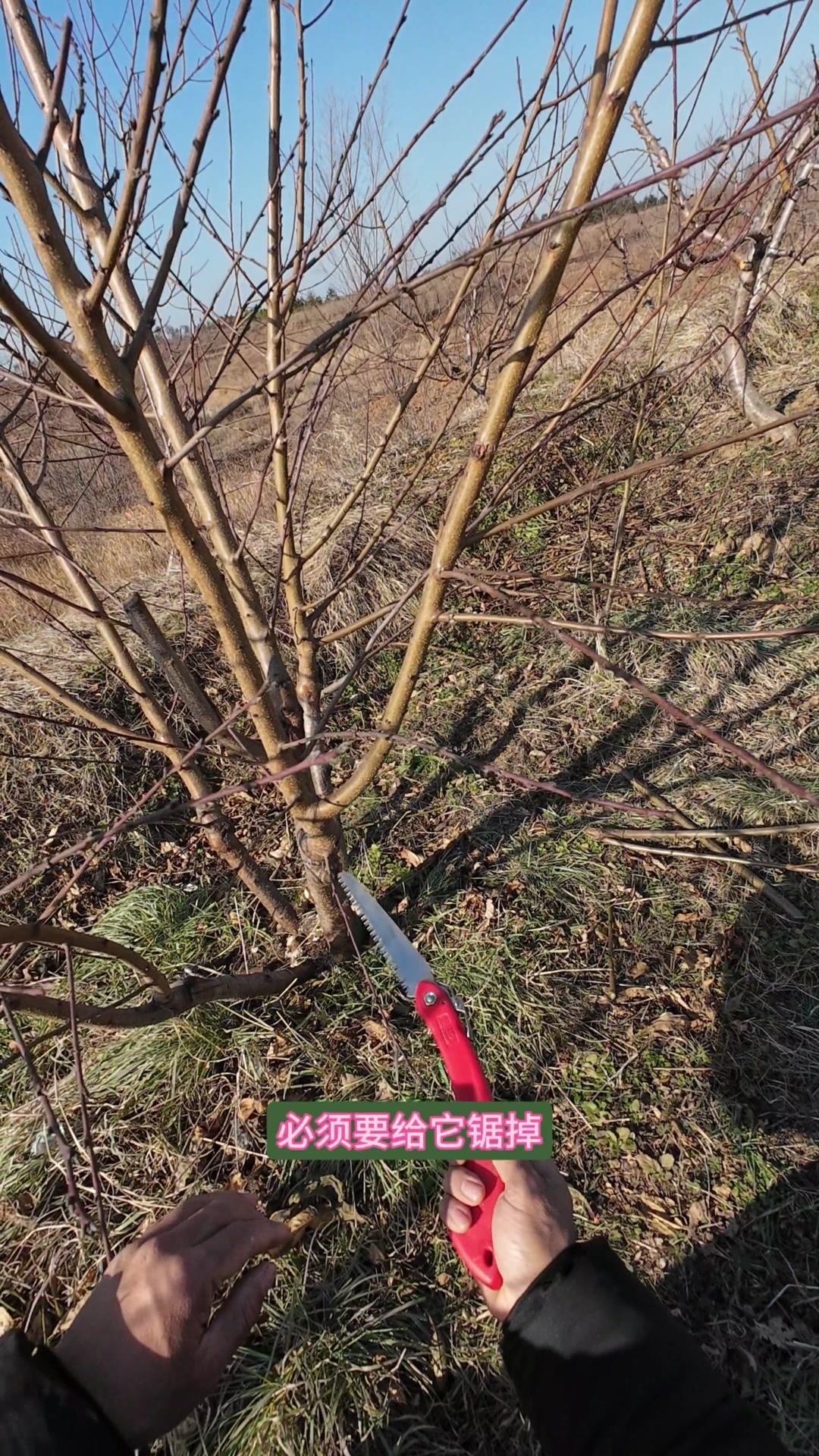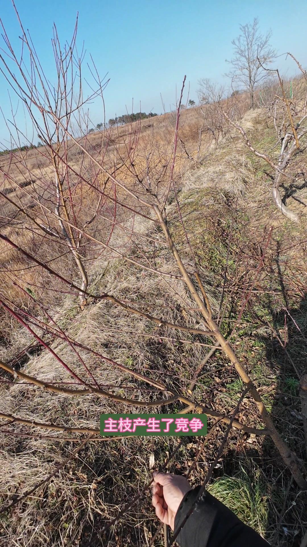 开心型小桃树修剪方法(44)📝5步教你桃树开心型修剪,来年结果翻倍! 这棵桃树修剪目的主要是定骨架,有多个主干,可以培养成开心型。在中部有两个直立的主枝,快速拉伸又遮挡其他侧枝的光线,必须下狠手,今年不锯,明年是个大麻烦,必须给它锯掉。 中部这个大的主枝在中间有点碍事,当断不断以后更乱,这好大一个枝,剪除中心枝打开了空间。它为主枝,这个位置比较好,和主枝竞争的枝条必须剪掉,下部枝组保留,结一年果,上面有优质的结果枝,保留结果枝回缩,确保产量。 这是主枝延伸头,这个主枝朝南,不能让它这么高,必须给它低高度。选定它为主枝,竞争枝剪掉,保留结果枝,与主枝竞争的枝条剪掉。这个枝有些直立,打开角度,清理好主枝延伸头,保持单枝延伸,重叠枝剪掉。 看这个主枝的修剪,出现了一个竞争枝,主枝产生了竞争,有结果枝也不要竞争枝,第二背上枝剪掉,下部培养一个枝组。原先预留的主枝延伸头角度直立,没有空间了,换个头打开角度,保留结果枝。 共保留四大主枝,保留一定产量,是一个侧枝,保留临时结果,结完果以后,明年有下部侧枝再进行压缩,结完果之后可以去掉。这是很好的一个树形。