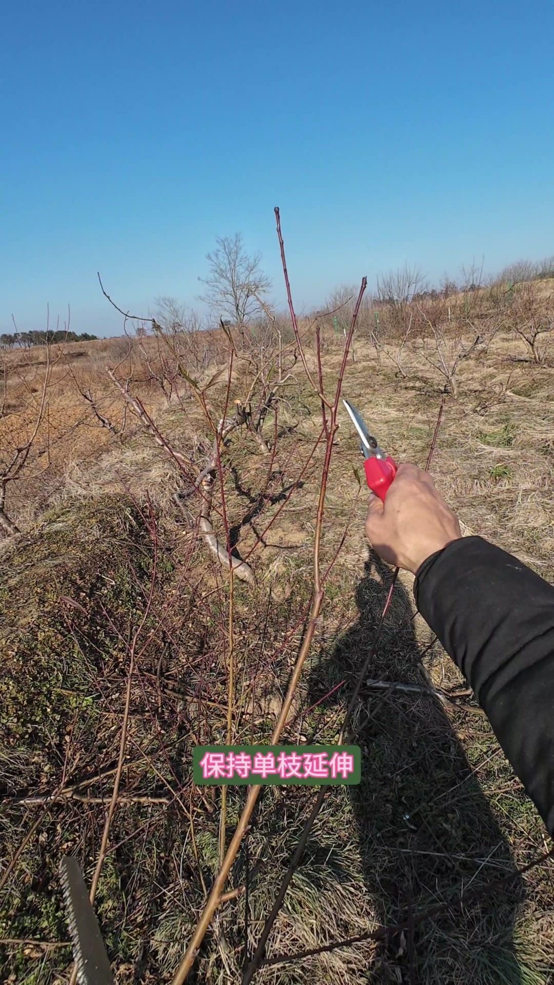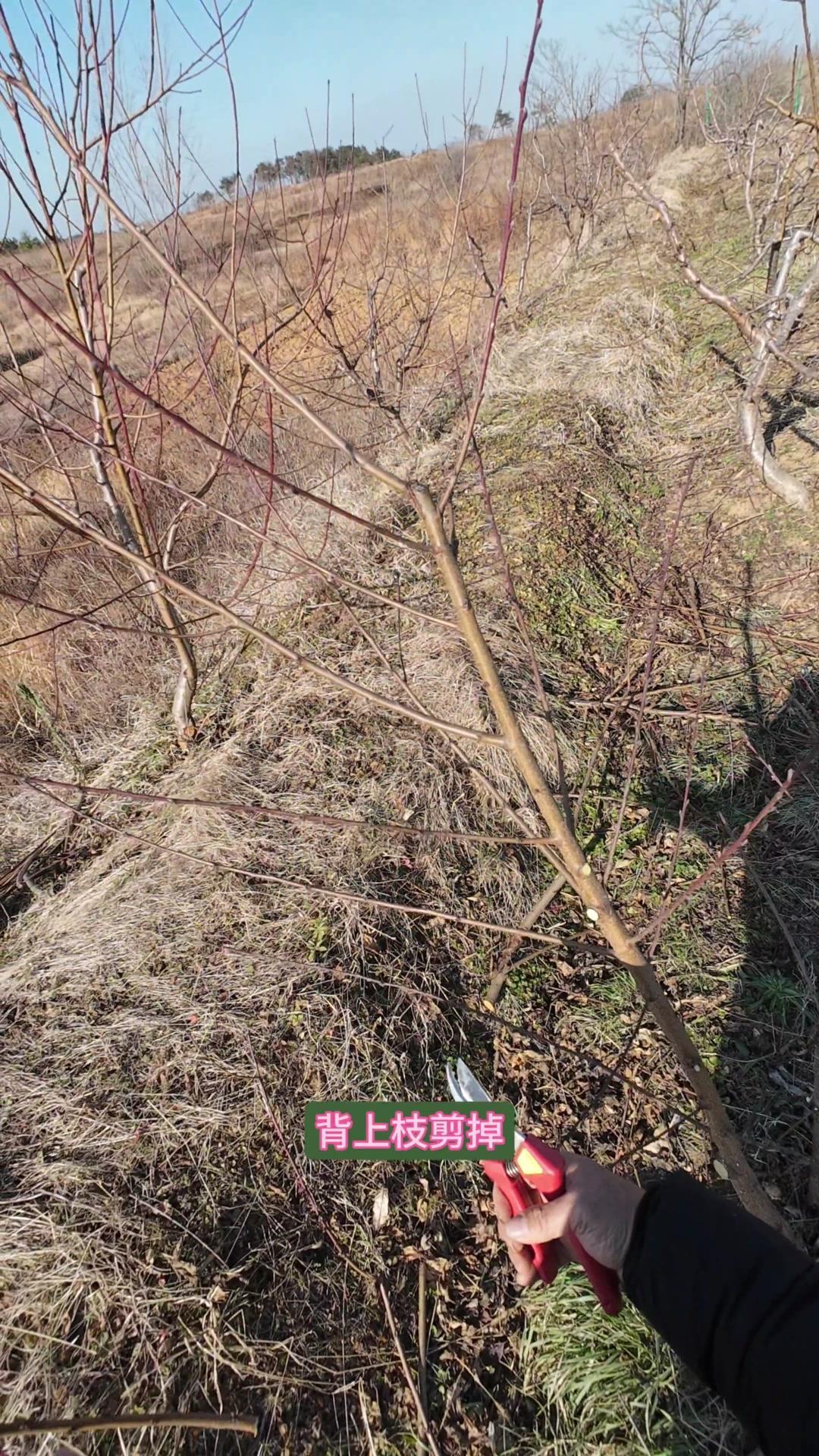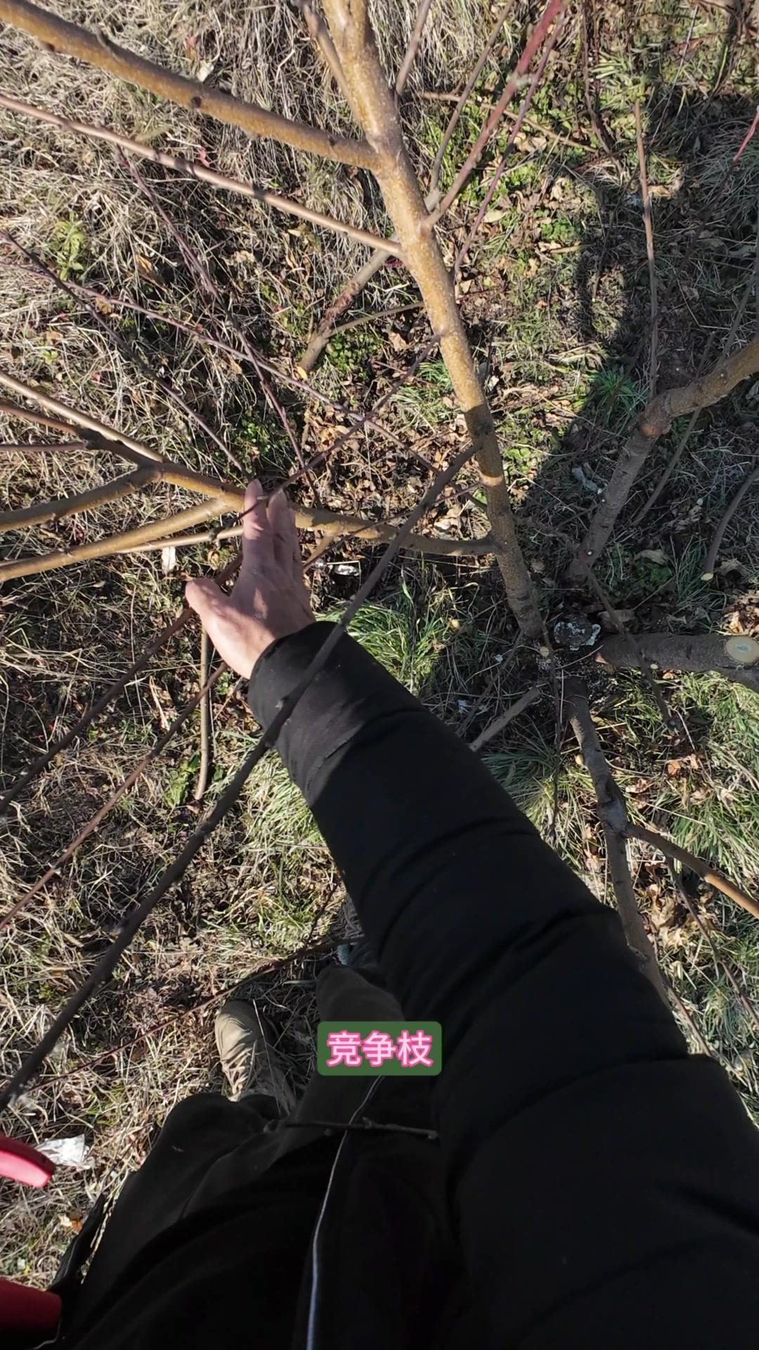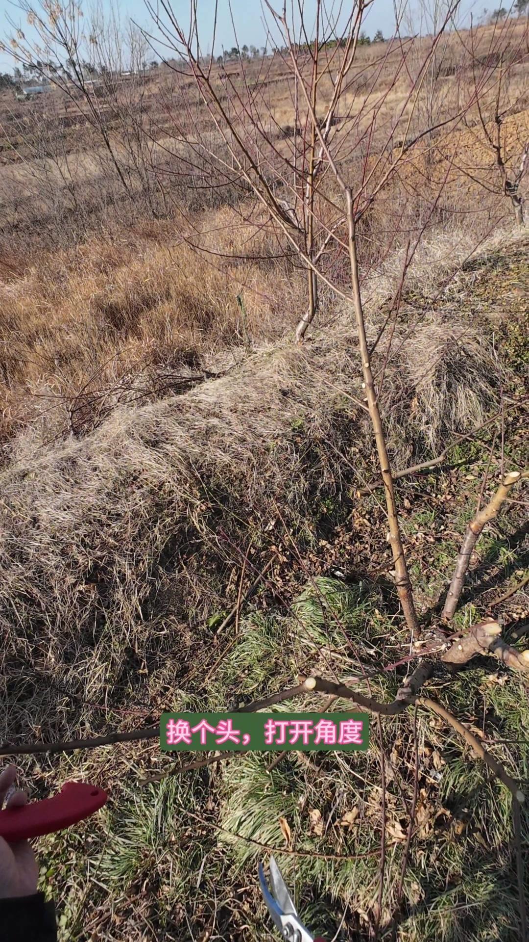开心型小桃树修剪方法(44)📝5步教你桃树开心型修剪,来年结果翻倍! 这棵桃树修剪目的主要是定骨架,有多个主干,可以培养成开心型。在中部有两个直立的主枝,快速拉伸又遮挡其他侧枝的光线,必须下狠手,今年不锯,明年是个大麻烦,必须给它锯掉。 中部这个大的主枝在中间有点碍事,当断不断以后更乱,这好大一个枝,剪除中心枝打开了空间。它为主枝,这个位置比较好,和主枝竞争的枝条必须剪掉,下部枝组保留,结一年果,上面有优质的结果枝,保留结果枝回缩,确保产量。 这是主枝延伸头,这个主枝朝南,不能让它这么高,必须给它低高度。选定它为主枝,竞争枝剪掉,保留结果枝,与主枝竞争的枝条剪掉。这个枝有些直立,打开角度,清理好主枝延伸头,保持单枝延伸,重叠枝剪掉。 看这个主枝的修剪,出现了一个竞争枝,主枝产生了竞争,有结果枝也不要竞争枝,第二背上枝剪掉,下部培养一个枝组。原先预留的主枝延伸头角度直立,没有空间了,换个头打开角度,保留结果枝。 共保留四大主枝,保留一定产量,是一个侧枝,保留临时结果,结完果以后,明年有下部侧枝再进行压缩,结完果之后可以去掉。这是很好的一个树形。