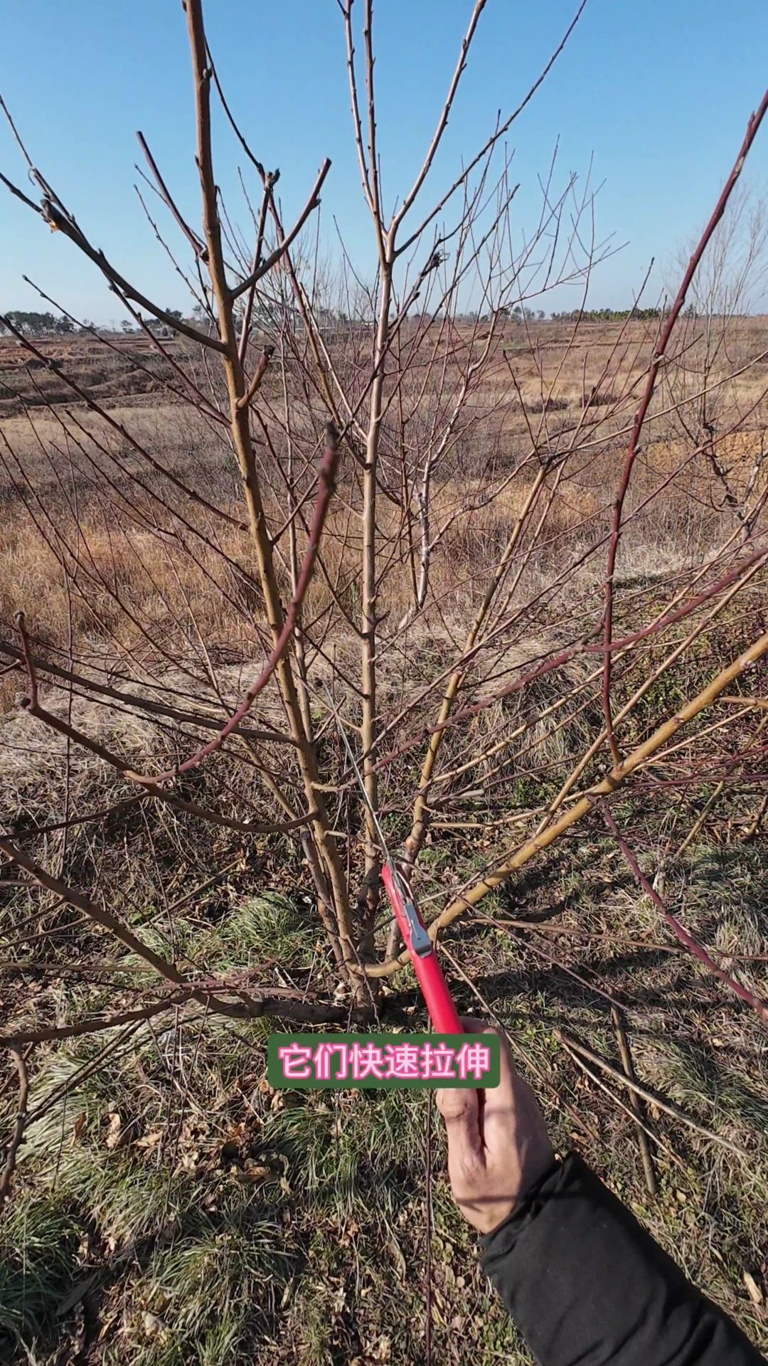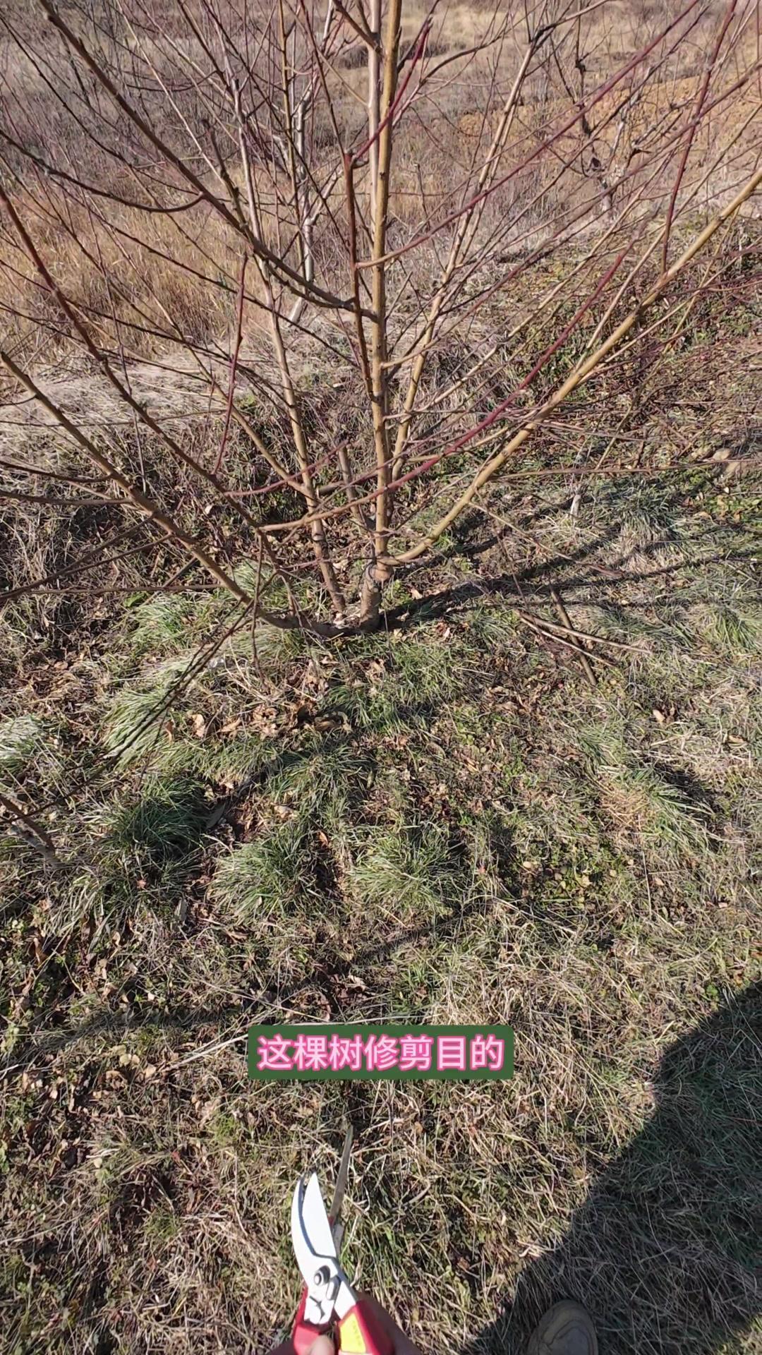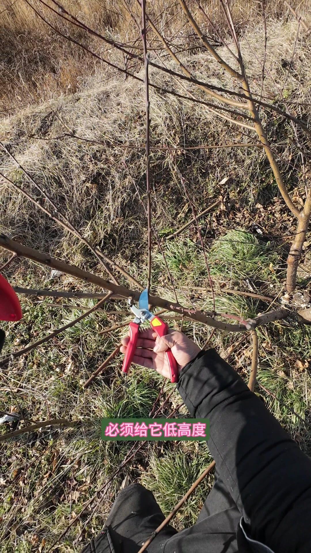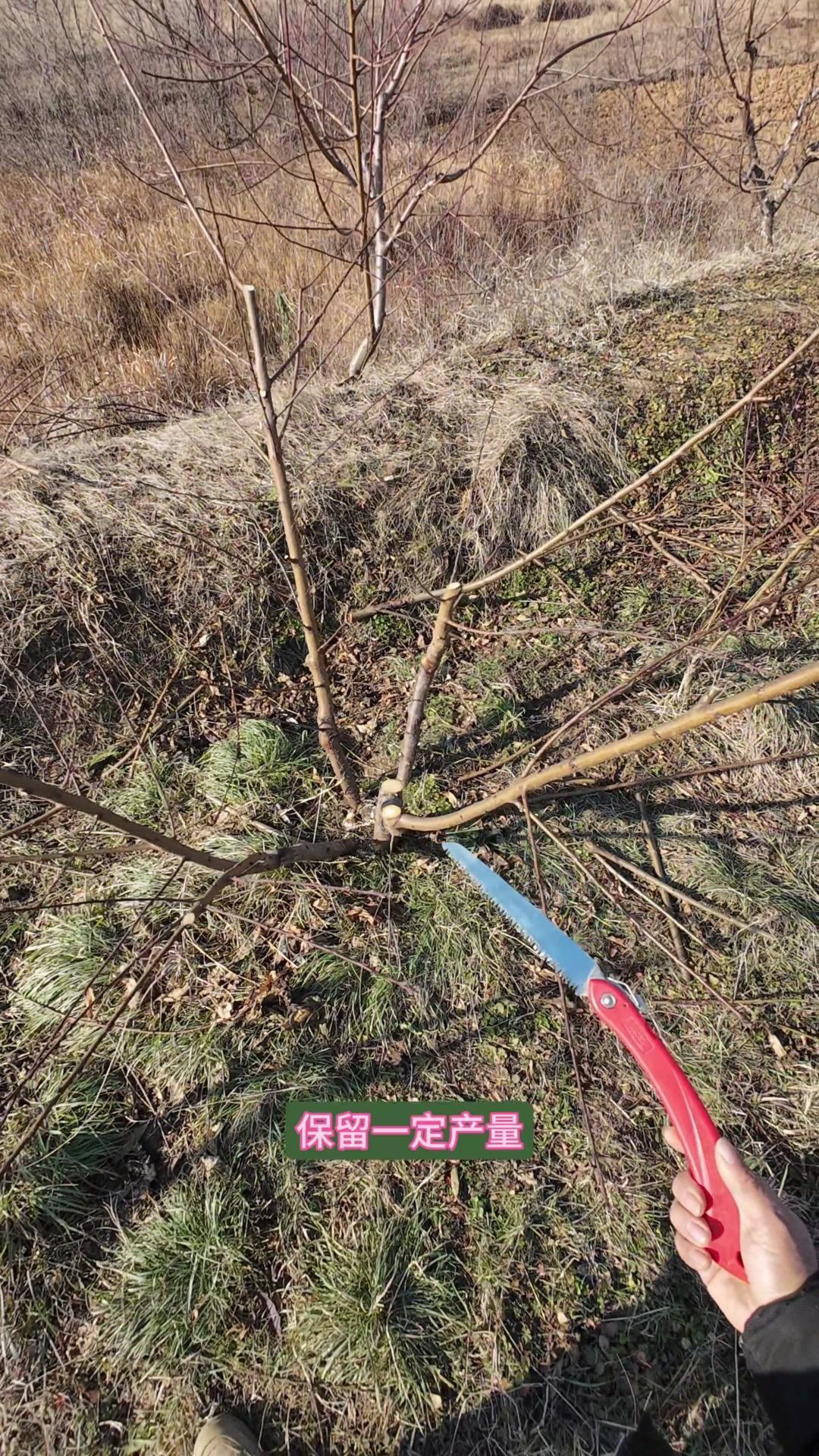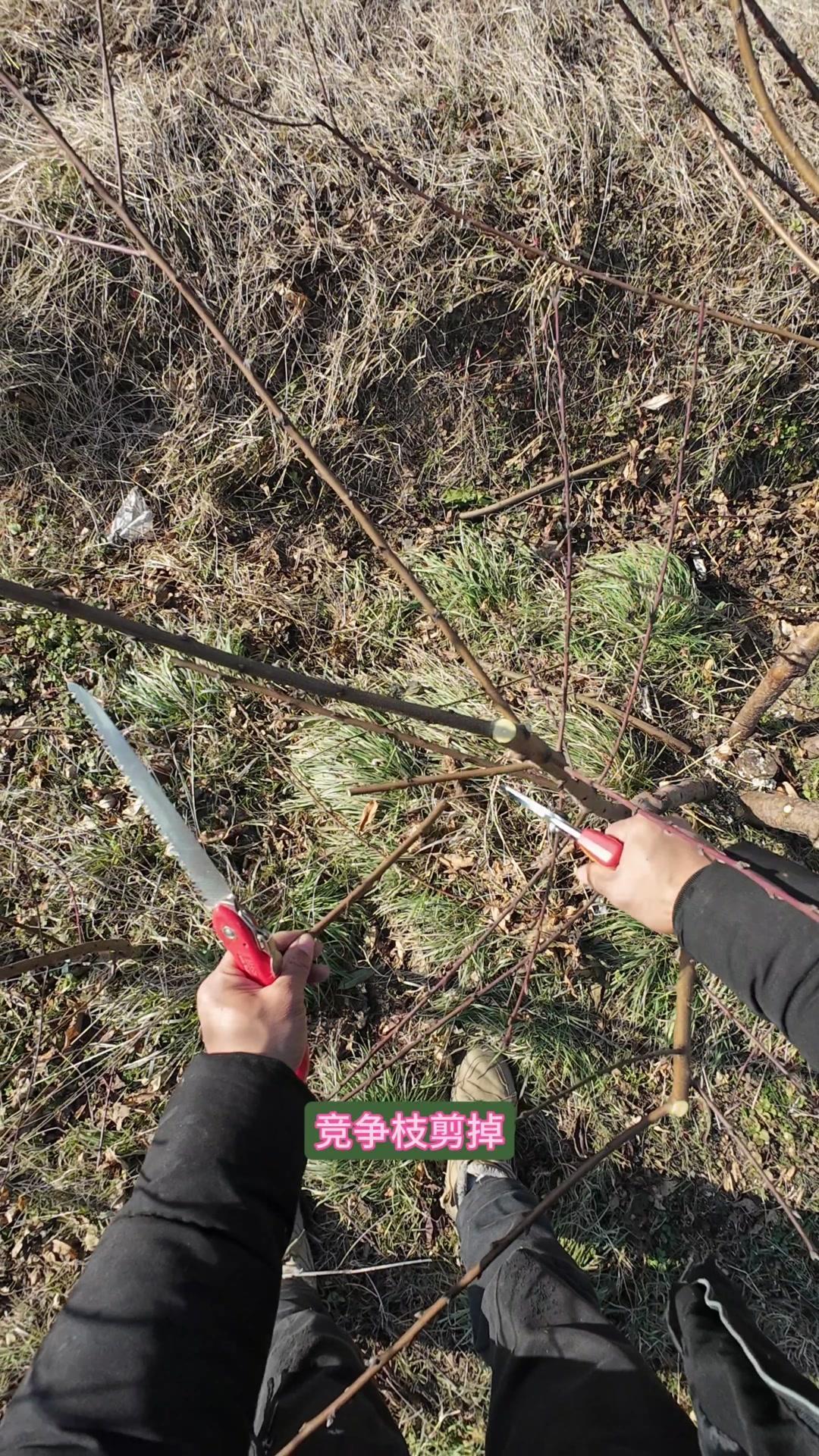开心型小桃树修剪方法(44)📝5步教你桃树开心型修剪,来年结果翻倍! 这棵桃树修剪目的主要是定骨架,有多个主干,可以培养成开心型。在中部有两个直立的主枝,快速拉伸又遮挡其他侧枝的光线,必须下狠手,今年不锯,明年是个大麻烦,必须给它锯掉。 中部这个大的主枝在中间有点碍事,当断不断以后更乱,这好大一个枝,剪除中心枝打开了空间。它为主枝,这个位置比较好,和主枝竞争的枝条必须剪掉,下部枝组保留,结一年果,上面有优质的结果枝,保留结果枝回缩,确保产量。 这是主枝延伸头,这个主枝朝南,不能让它这么高,必须给它低高度。选定它为主枝,竞争枝剪掉,保留结果枝,与主枝竞争的枝条剪掉。这个枝有些直立,打开角度,清理好主枝延伸头,保持单枝延伸,重叠枝剪掉。 看这个主枝的修剪,出现了一个竞争枝,主枝产生了竞争,有结果枝也不要竞争枝,第二背上枝剪掉,下部培养一个枝组。原先预留的主枝延伸头角度直立,没有空间了,换个头打开角度,保留结果枝。 共保留四大主枝,保留一定产量,是一个侧枝,保留临时结果,结完果以后,明年有下部侧枝再进行压缩,结完果之后可以去掉。这是很好的一个树形。