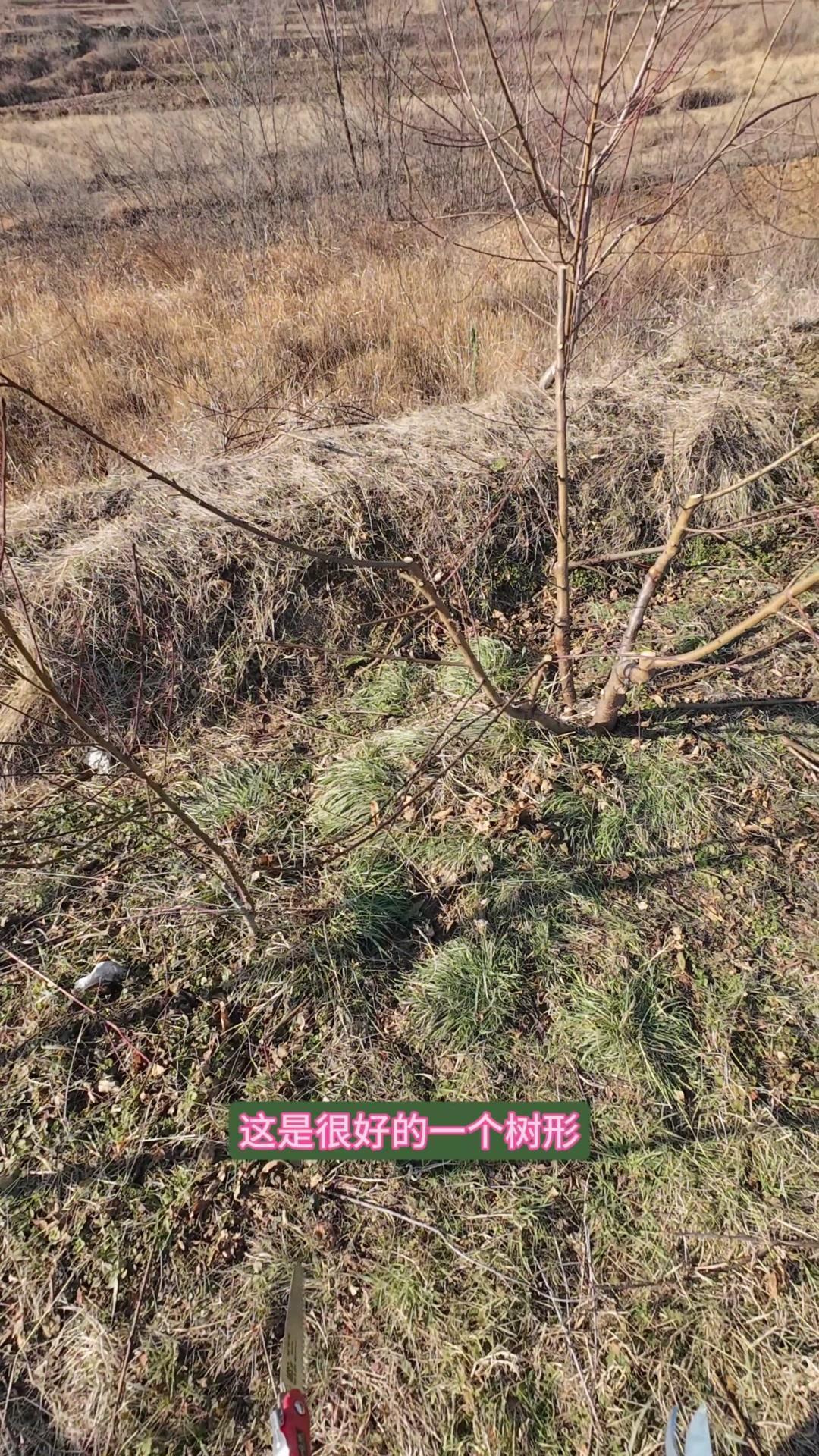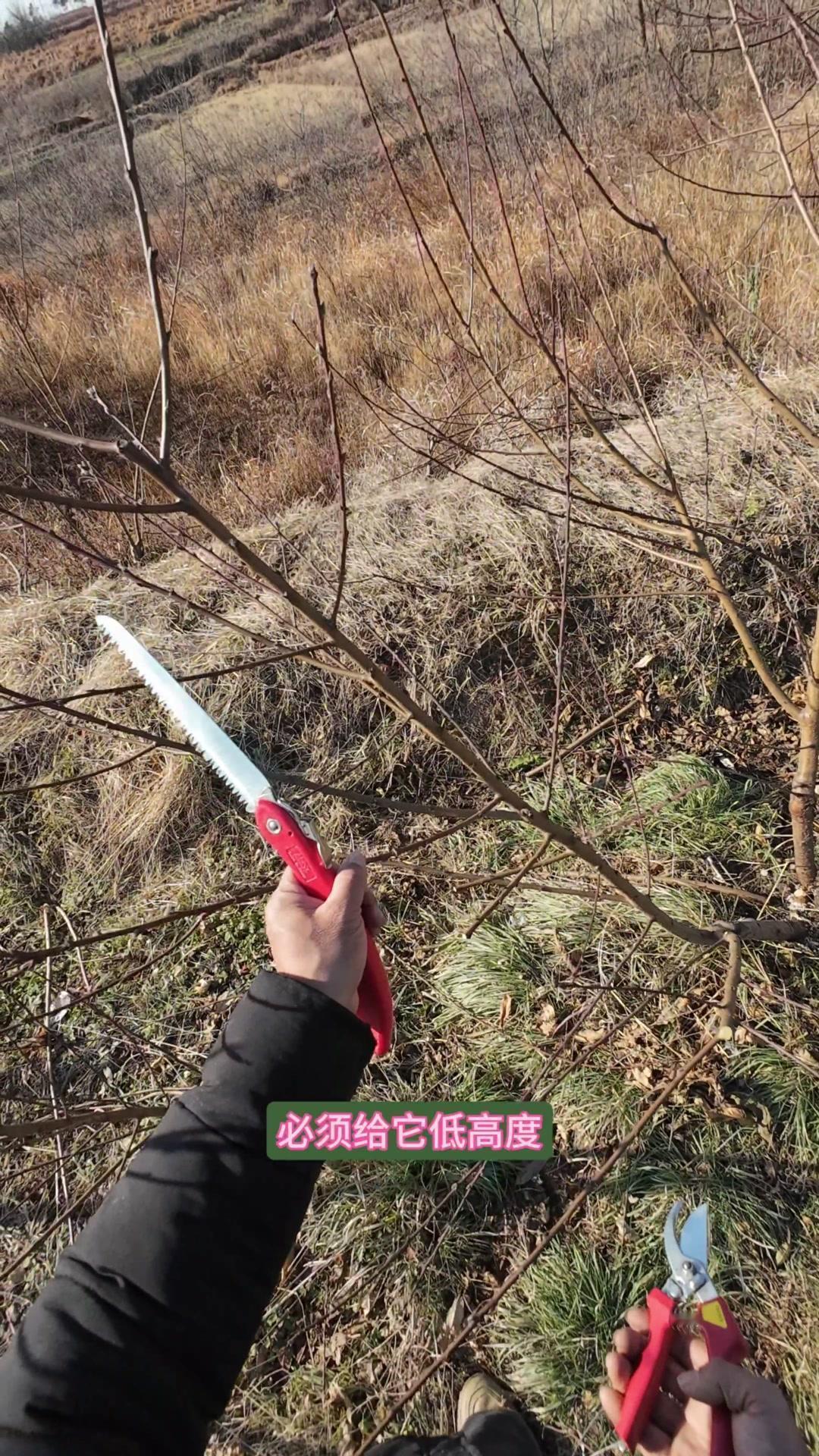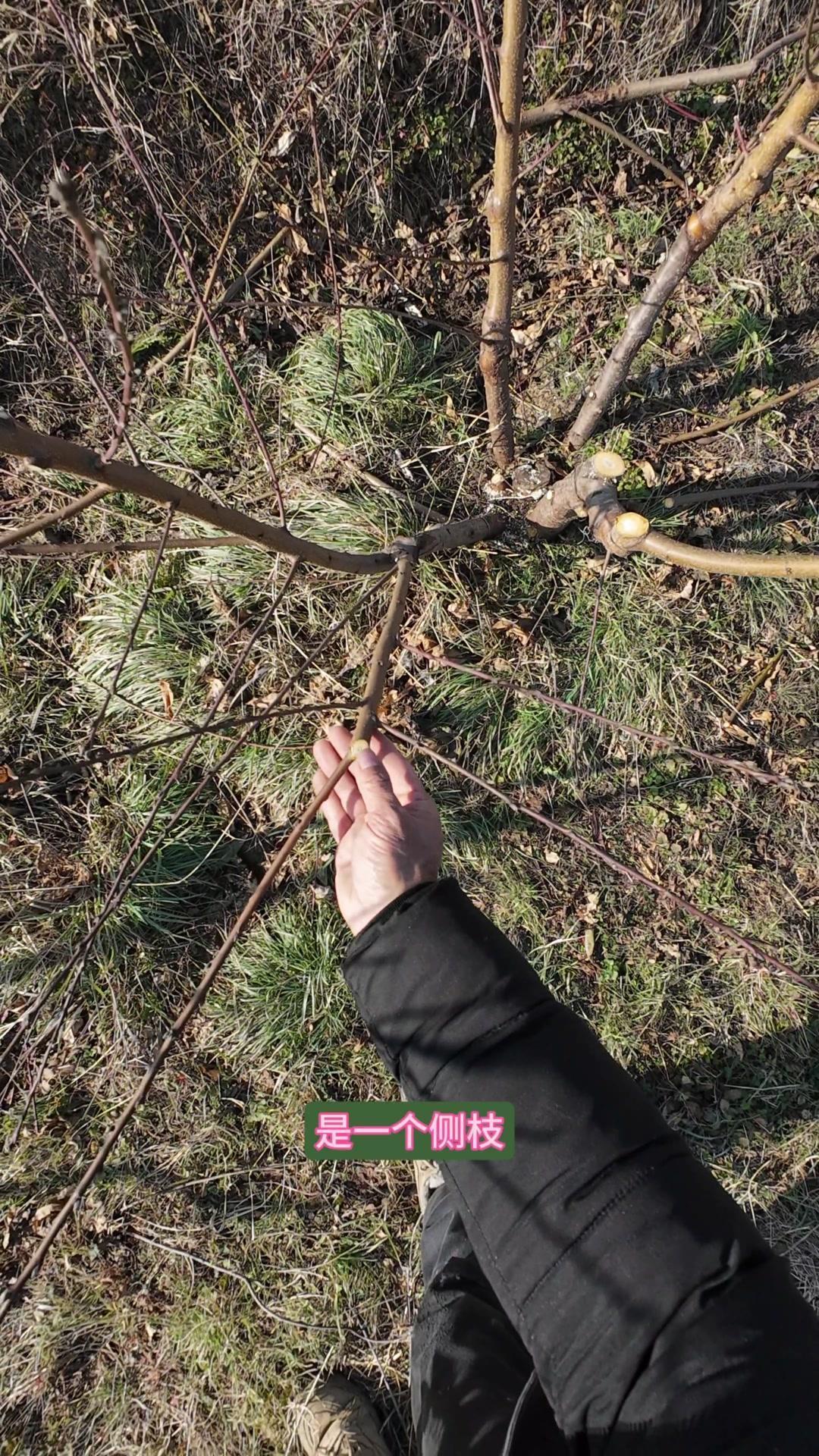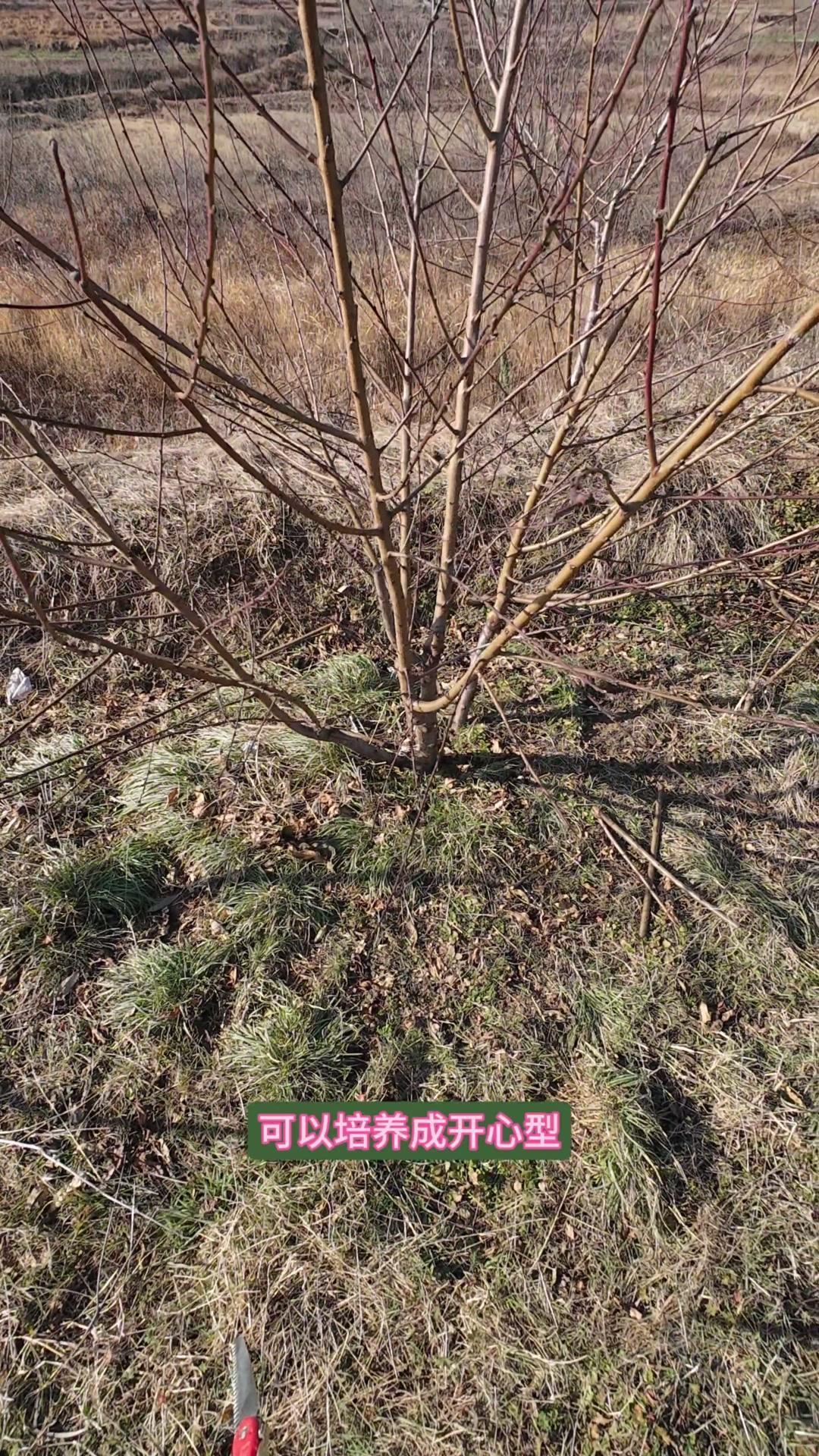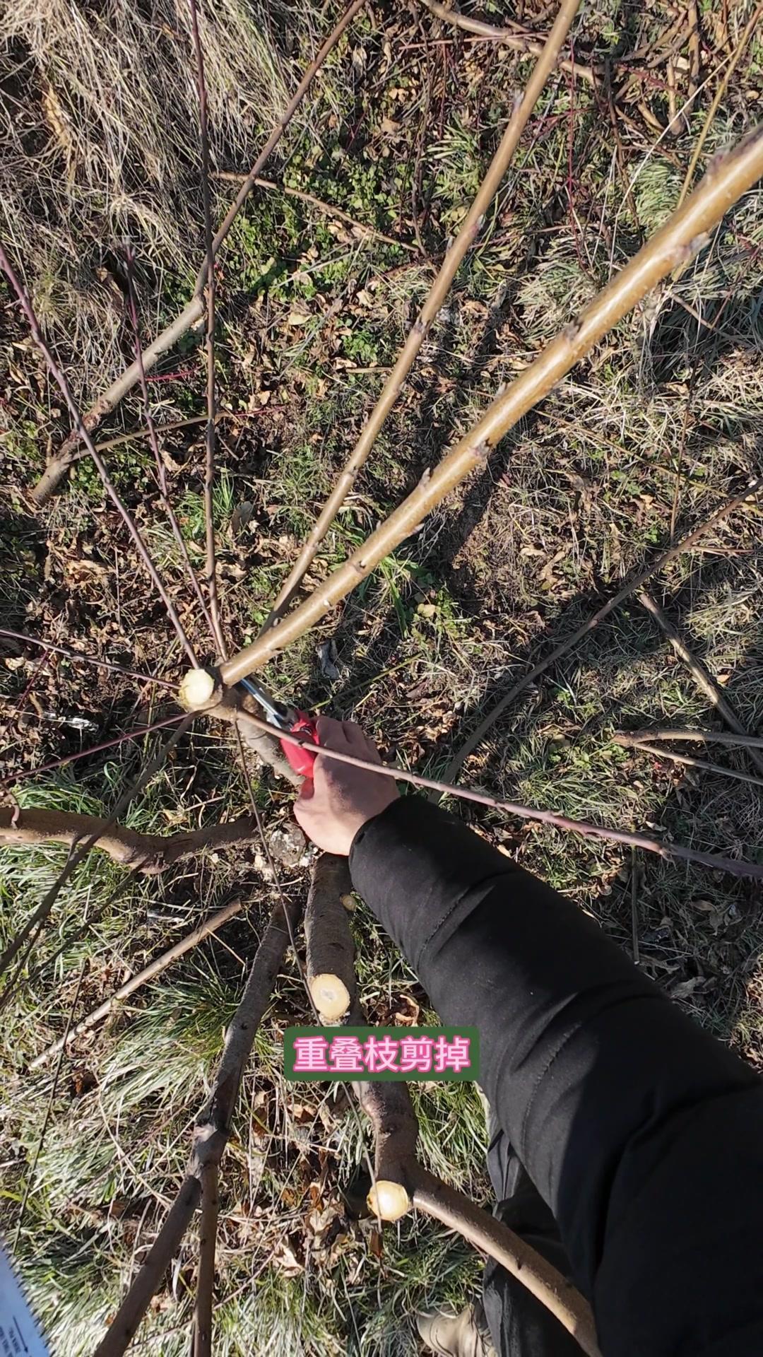 开心型小桃树修剪方法(44)📝5步教你桃树开心型修剪,来年结果翻倍! 这棵桃树修剪目的主要是定骨架,有多个主干,可以培养成开心型。在中部有两个直立的主枝,快速拉伸又遮挡其他侧枝的光线,必须下狠手,今年不锯,明年是个大麻烦,必须给它锯掉。 中部这个大的主枝在中间有点碍事,当断不断以后更乱,这好大一个枝,剪除中心枝打开了空间。它为主枝,这个位置比较好,和主枝竞争的枝条必须剪掉,下部枝组保留,结一年果,上面有优质的结果枝,保留结果枝回缩,确保产量。 这是主枝延伸头,这个主枝朝南,不能让它这么高,必须给它低高度。选定它为主枝,竞争枝剪掉,保留结果枝,与主枝竞争的枝条剪掉。这个枝有些直立,打开角度,清理好主枝延伸头,保持单枝延伸,重叠枝剪掉。 看这个主枝的修剪,出现了一个竞争枝,主枝产生了竞争,有结果枝也不要竞争枝,第二背上枝剪掉,下部培养一个枝组。原先预留的主枝延伸头角度直立,没有空间了,换个头打开角度,保留结果枝。 共保留四大主枝,保留一定产量,是一个侧枝,保留临时结果,结完果以后,明年有下部侧枝再进行压缩,结完果之后可以去掉。这是很好的一个树形。