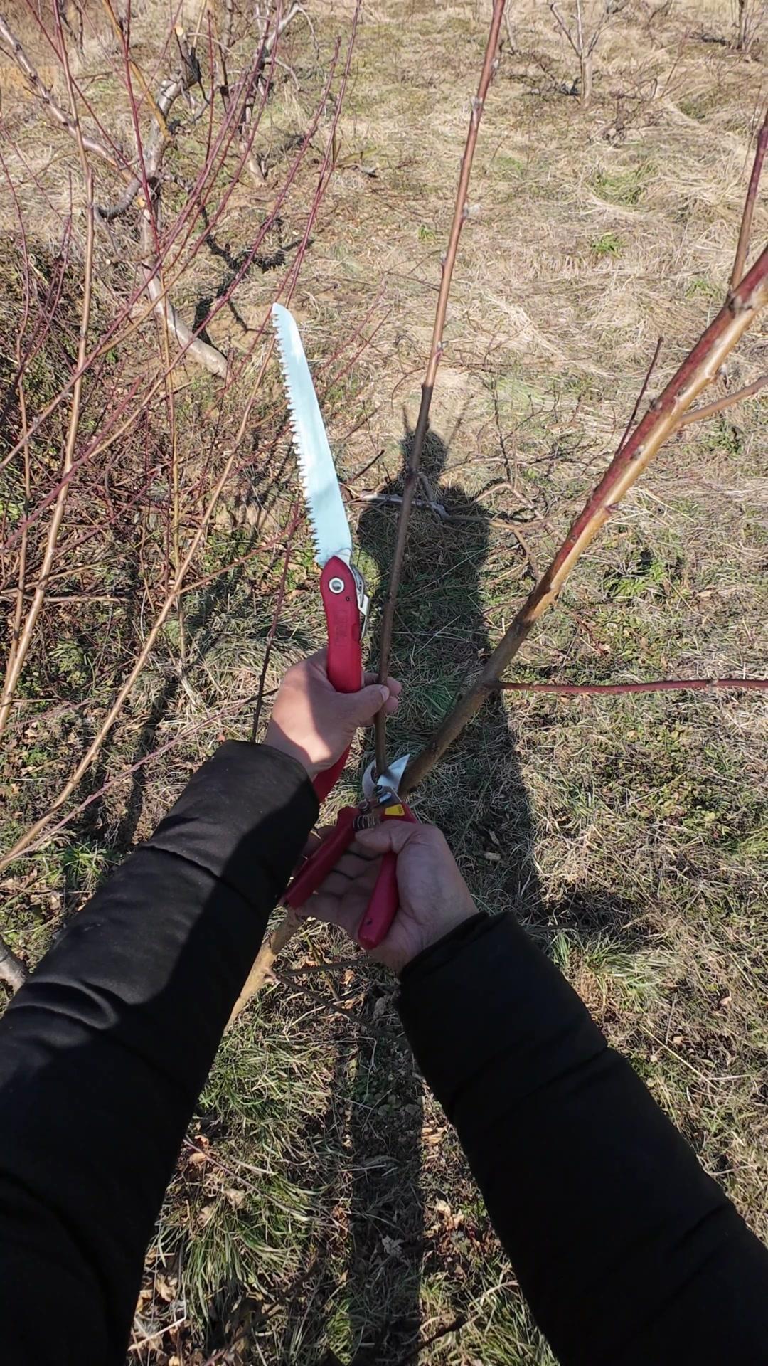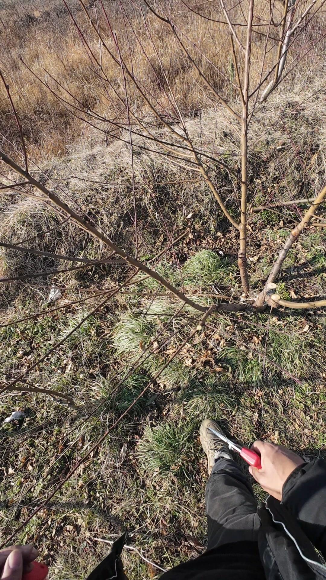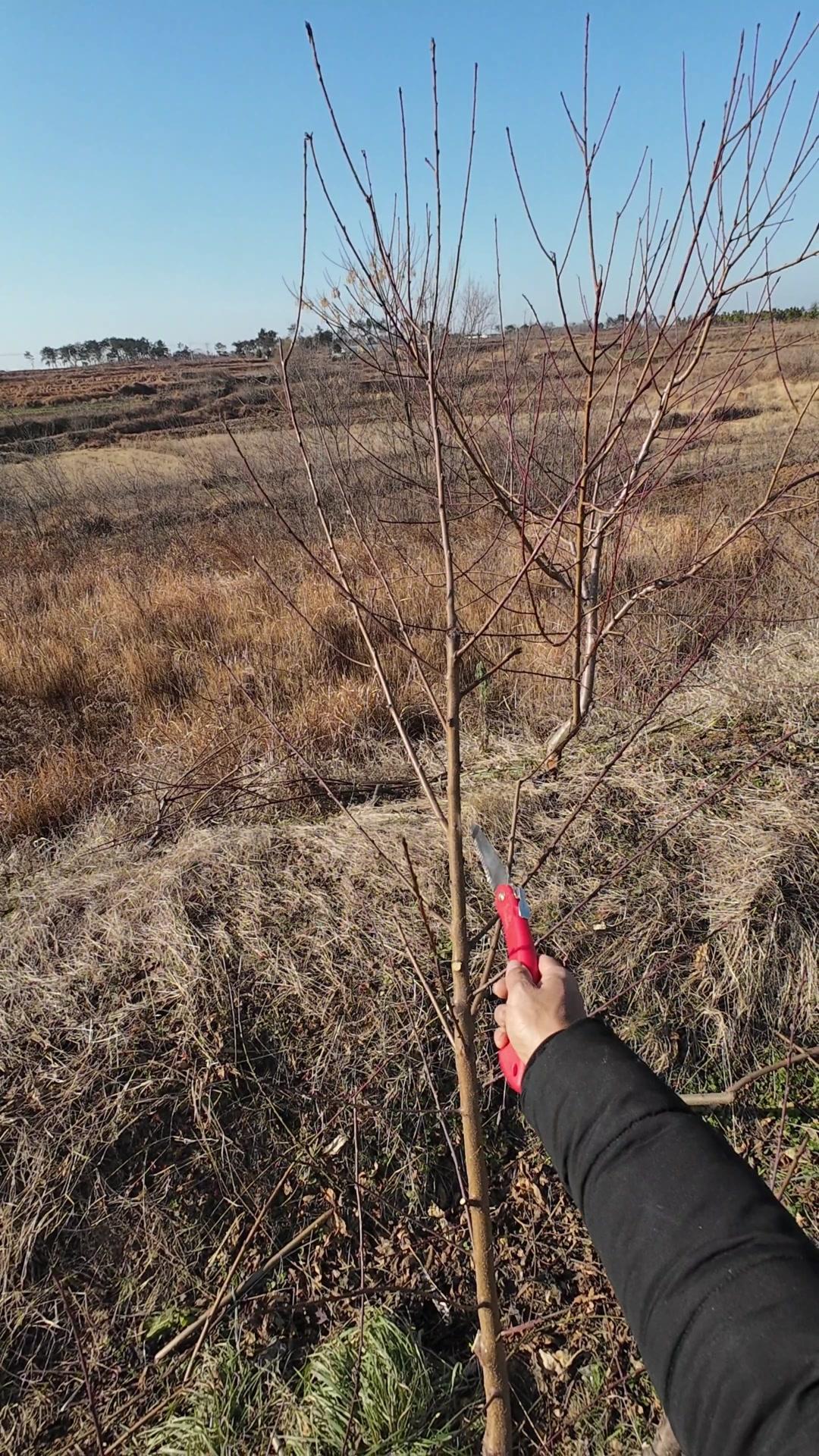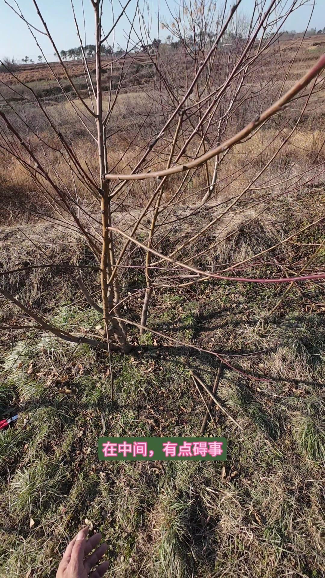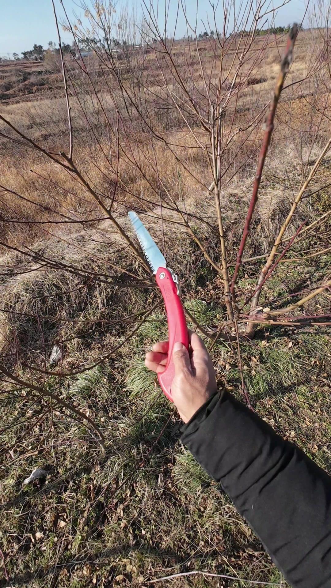 开心型小桃树修剪方法(44)📝5步教你桃树开心型修剪,来年结果翻倍! 这棵桃树修剪目的主要是定骨架,有多个主干,可以培养成开心型。在中部有两个直立的主枝,快速拉伸又遮挡其他侧枝的光线,必须下狠手,今年不锯,明年是个大麻烦,必须给它锯掉。 中部这个大的主枝在中间有点碍事,当断不断以后更乱,这好大一个枝,剪除中心枝打开了空间。它为主枝,这个位置比较好,和主枝竞争的枝条必须剪掉,下部枝组保留,结一年果,上面有优质的结果枝,保留结果枝回缩,确保产量。 这是主枝延伸头,这个主枝朝南,不能让它这么高,必须给它低高度。选定它为主枝,竞争枝剪掉,保留结果枝,与主枝竞争的枝条剪掉。这个枝有些直立,打开角度,清理好主枝延伸头,保持单枝延伸,重叠枝剪掉。 看这个主枝的修剪,出现了一个竞争枝,主枝产生了竞争,有结果枝也不要竞争枝,第二背上枝剪掉,下部培养一个枝组。原先预留的主枝延伸头角度直立,没有空间了,换个头打开角度,保留结果枝。 共保留四大主枝,保留一定产量,是一个侧枝,保留临时结果,结完果以后,明年有下部侧枝再进行压缩,结完果之后可以去掉。这是很好的一个树形。