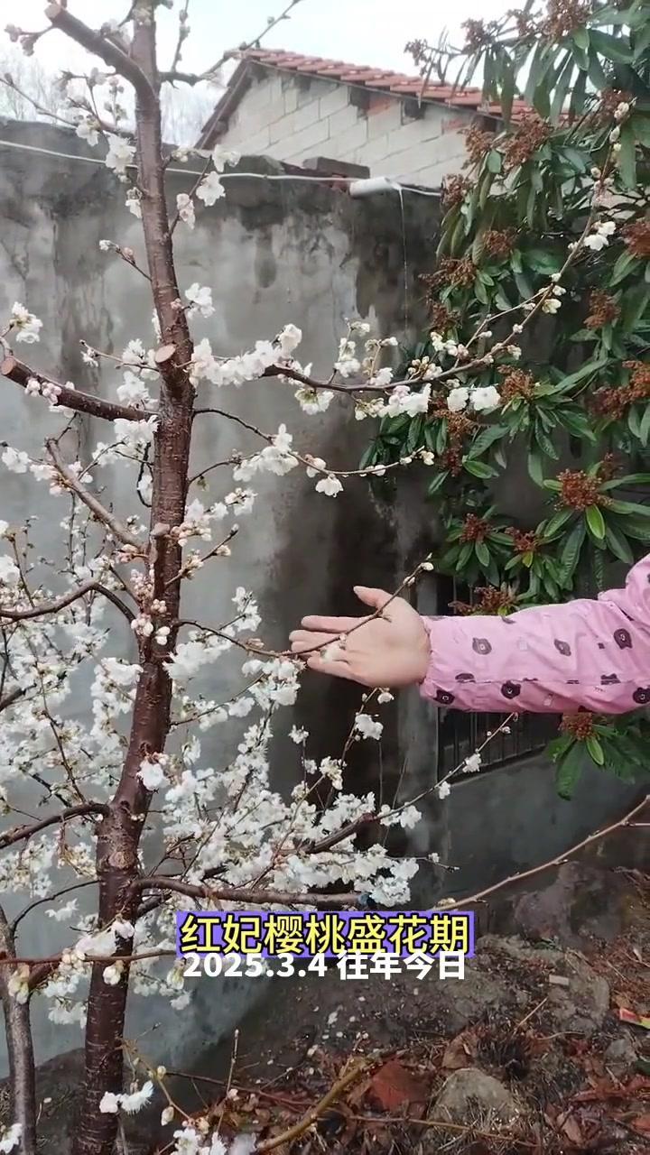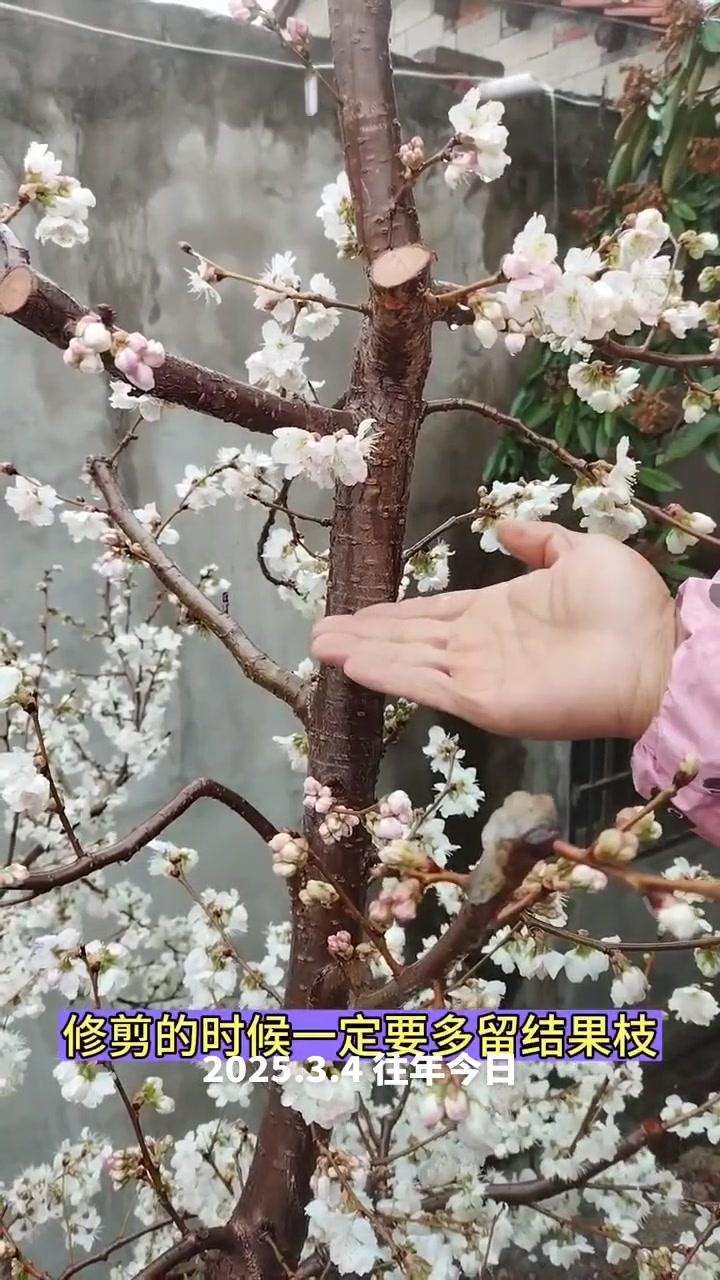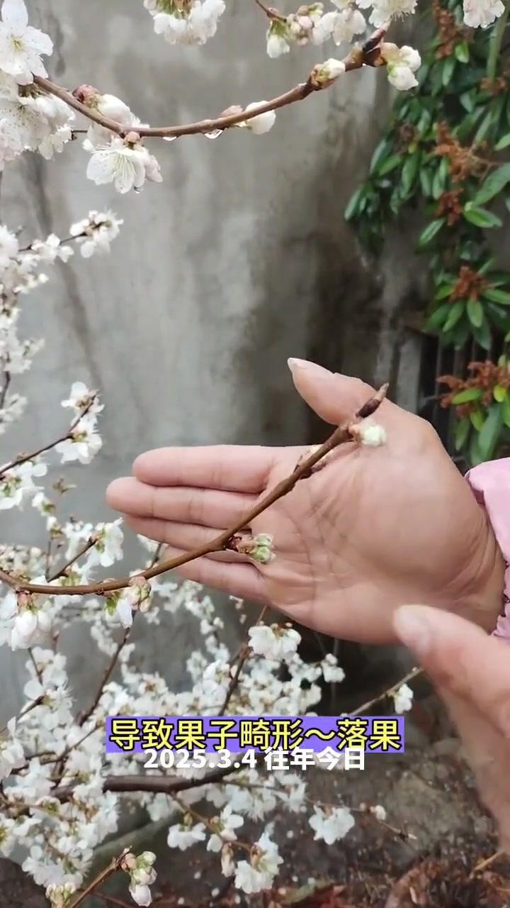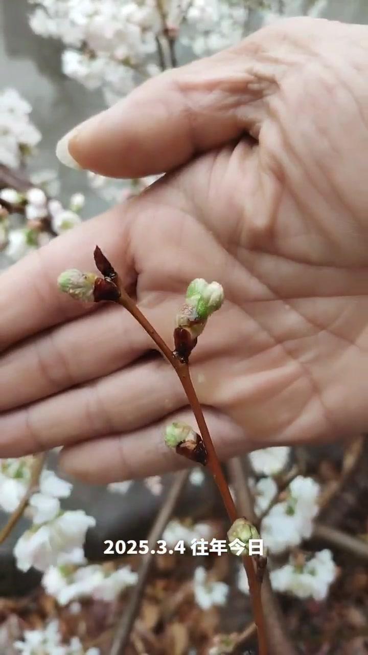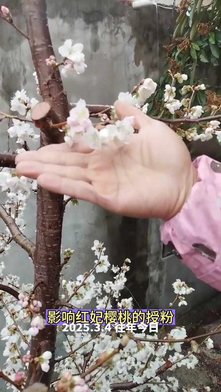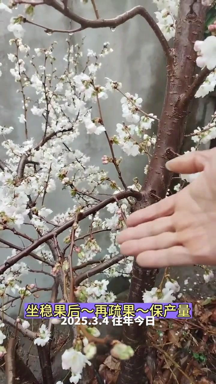 🌦️3月3日湖北阴雨天,红妃樱桃已进入盛发期,气温骤降至1℃,连阴天对授粉影响大。去年倒春寒严重,村民满树花却结很少果,今年需重点防范。 1️⃣修剪策略:多留小枝作为结果枝,避免大枝徒长,确保树体枝组势力均衡。红妃樱桃为小果型品种,结果枝分布均匀、粗细合适才能高产。 2️⃣花前管理:花苞露白时及时打药,选用吡虫啉+高效氯氟氰菊酯防治蚜虫,搭配苯醚甲环唑杀菌,控制第一代蚜虫繁殖基数,减少后续爆发。盛花期蚜虫危害幼果,导致畸形落果,此时花期敏感不能用药,需待花谢80%后再施花后药,中间留时间差。 3️⃣观察状态:红妃樱桃花苞开花速度比桃树快,高两天就绽放。花前药完成后,小枝均匀开花,腋花芽营养充足时会分化成花,若营养不足则成叶片,需耐心等待好天气保证授粉。
