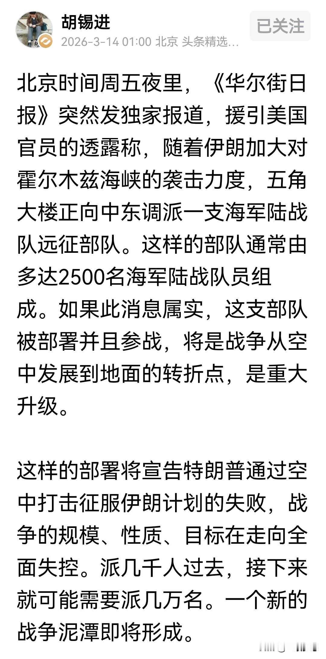 老胡今天发文说,《华尔街日报》援引老美官员的透露称,五角大楼正向中东调派一支通常有多达2500名队员的海军陆战队。 老胡兴奋地说,如果消息属实,将是战争从空中发展到地面的转折点,是战争的重大升级。战争走向全面失控,战争泥潭即将形成。 个人估计老美没有这个胆子扩大战争,如果投入地面部队,性质完全不同,更坐实了侵略战争,伊朗不会手软,一旦伤亡加大,双方不断加码,美国派更多的地面部队,很有可能陷于长期战争泥潭,万劫不复。 老美应该不傻,会吸取当年陷入阿富汗的教训,不想打长期战争,只想速战速决,得好处走人。它不想长期陷在伊朗,因为它还有更重要的对手,理论上它随时可以厚脸皮宣布自己赢了,战争结束了。 当然,战争形势瞬息万变,老美虽然不想陷入长期消耗战,但如果被时势裹挟着做出不情愿做的事,也不是没可能。 大家怎么看?