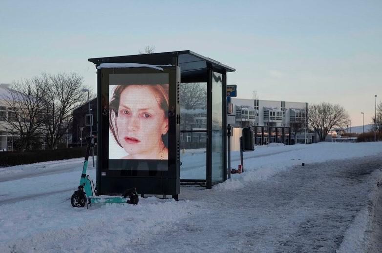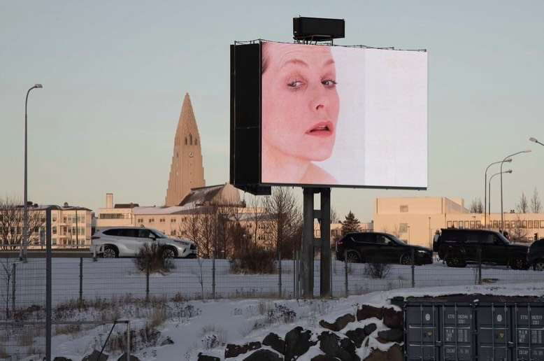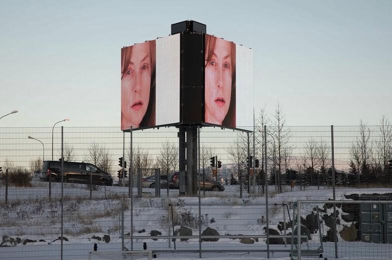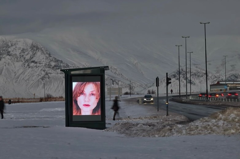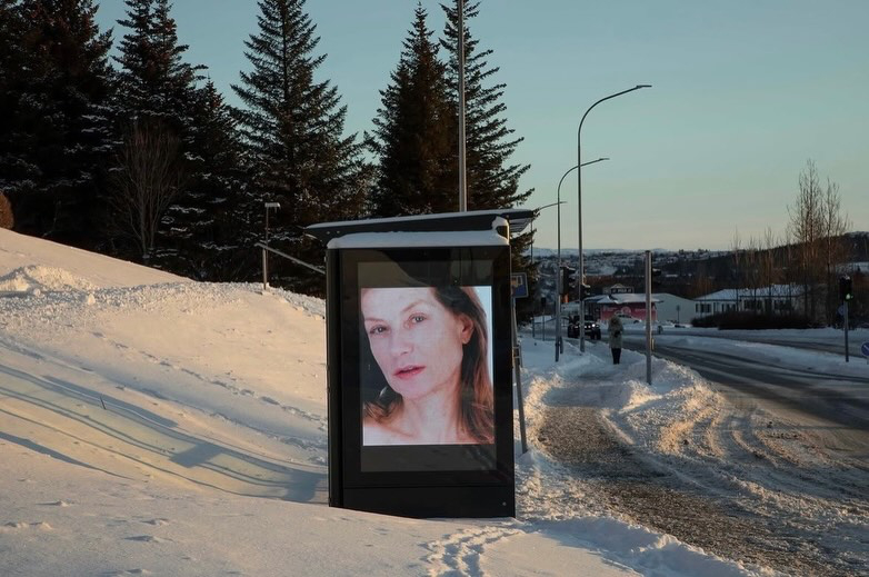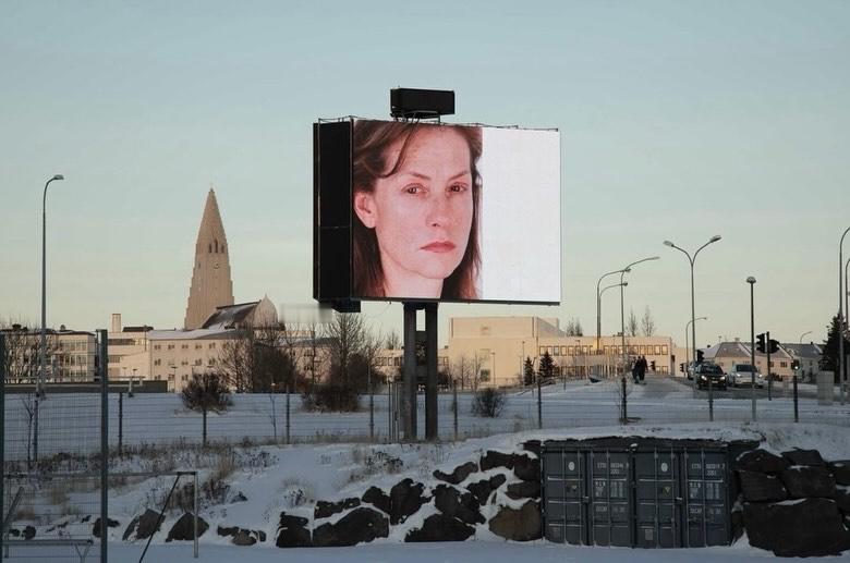 银幕闲话 罗妮·霍恩为伊莎贝尔·于佩尔创作的肖像系列,曾于2025年开年的三天里,在冰岛首都雷克雅未克的数字广告牌、信息亭和公交站点呈现,与城市日常形成短暂重叠。