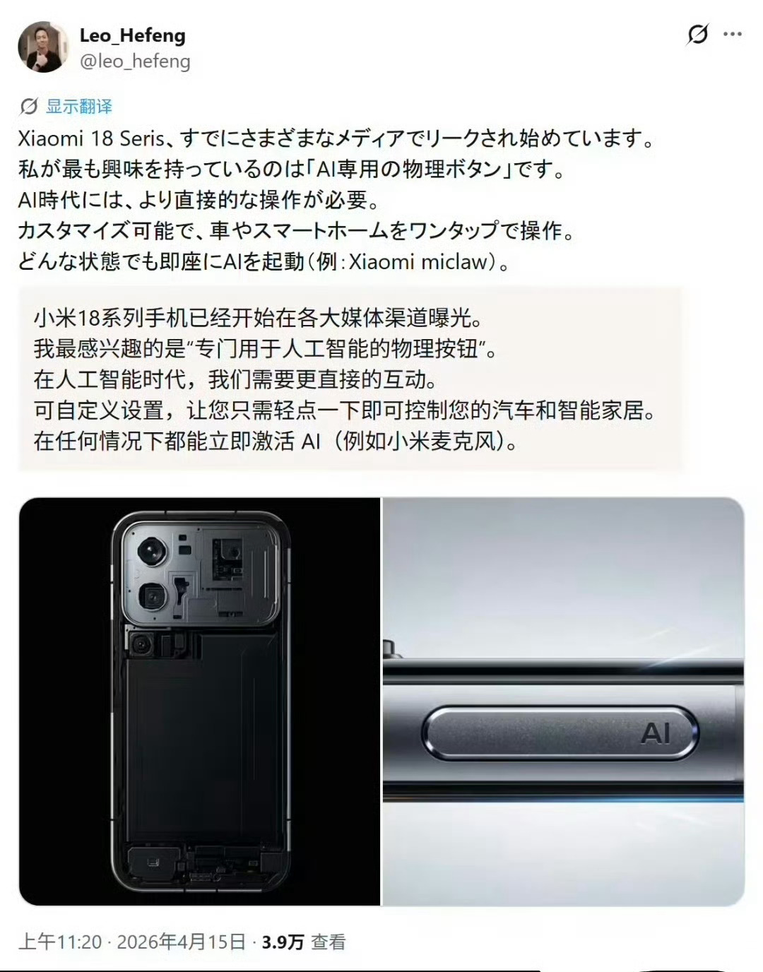 小米18 系列爆料新增ai按键、一键呼叫小爱同学、控制iot设备更方便了!