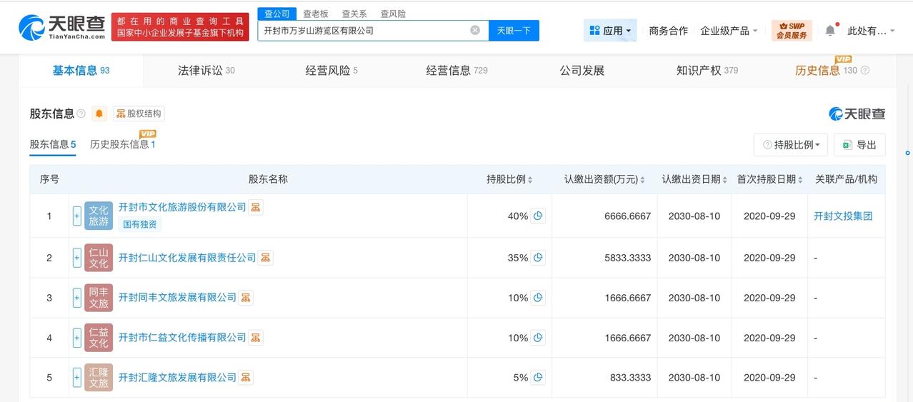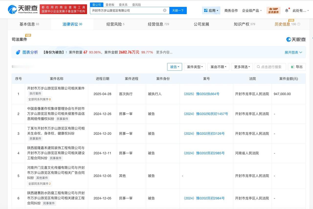 揭秘露脚踝大象景区关联公司 露脚踝大象景区关联公司涉多起纠纷河南一景区露脚踝大象系演员扮演 近日,网传视频河南万岁山武侠城节目演出中,出现了两只“大象”,露出了人的脚踝。工作人员表示,节目中的大象由4名工作人员扮演。 天眼查App显示,万岁山武侠城关联公司开封市万岁山游览区有限公司成立于2004年8月,法定代表人为李隆日,注册资本约1.7亿人民币,经营范围含游览景区管理、园区管理服务、城市公园管理、企业管理、旅游开发项目策划咨询、以自有资金从事投资活动等,由开封市文化旅游股份有限公司、开封仁山文化发展有限责任公司等共同持股。 风险信息显示,该公司涉及多起法律诉讼,案由涉及生命权、健康权、身体权纠纷,服务合同纠纷,侵害作品信息网络传播权纠纷等。 天眼查信息: