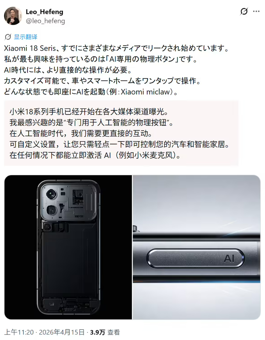 小米18Pro新增AI按键 新增独立的AI按键现在小爱使用频率太高了,确实应该加个AI键