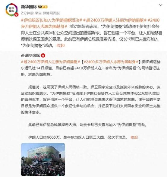 总统、议长都加入了为伊朗捐躯活动,全国9000万人,已经有超2400万伊朗人登记注册,都愿意为国捐躯。请美以看看,这样的一个国家,你们凭什么觉得,你们能征服? 据伊朗迈赫尔通讯社14日报道,目前已有超2410万伊朗人在一家名为“为伊朗捐躯”的网站登记注册,志愿为国献身。其中还包括了伊朗的总统和议长。 以色列人口才900万,美国虽然人多,但支持这场战争的也没多少!如果美以胆敢开启地面战,必然陷然泥潭!有了这2400多万人的抵抗意志,伊朗动员三四百万军队,没问题吧? 个人认为,美以这种侵略者,根本无法想象伊朗这种有6000年文明的国家,到底蕴含着多大的力量!上到伊朗总统佩泽希齐扬、议长卡利巴夫,这种高层。下到贩夫走卒,伊朗不屈的意志是难以磨灭的,这样的国家,也是不会被征服的!