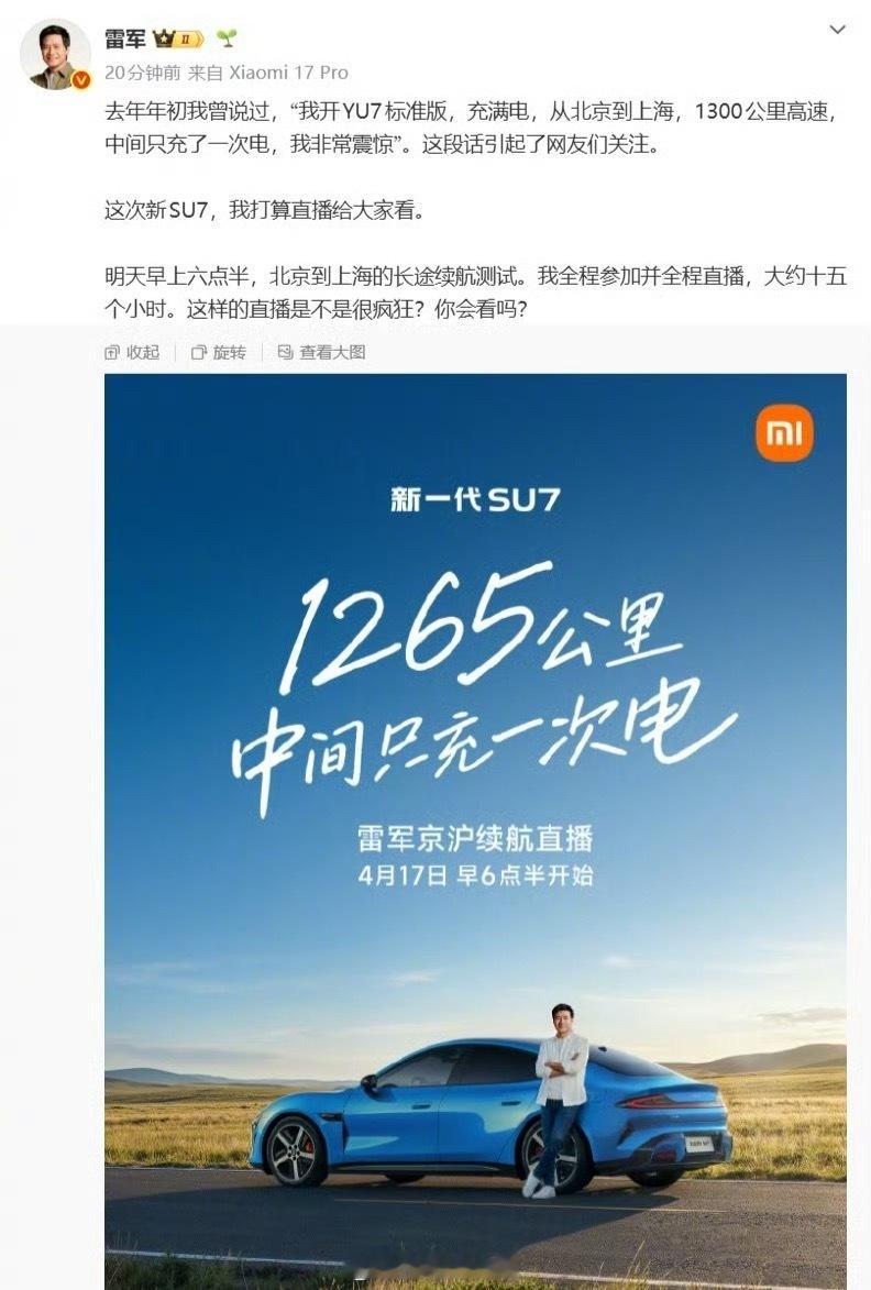 雷军拼了!亲自直播 15 小时,1265 公里中间只充一次电,新一代小米 SU7 北京到上海。